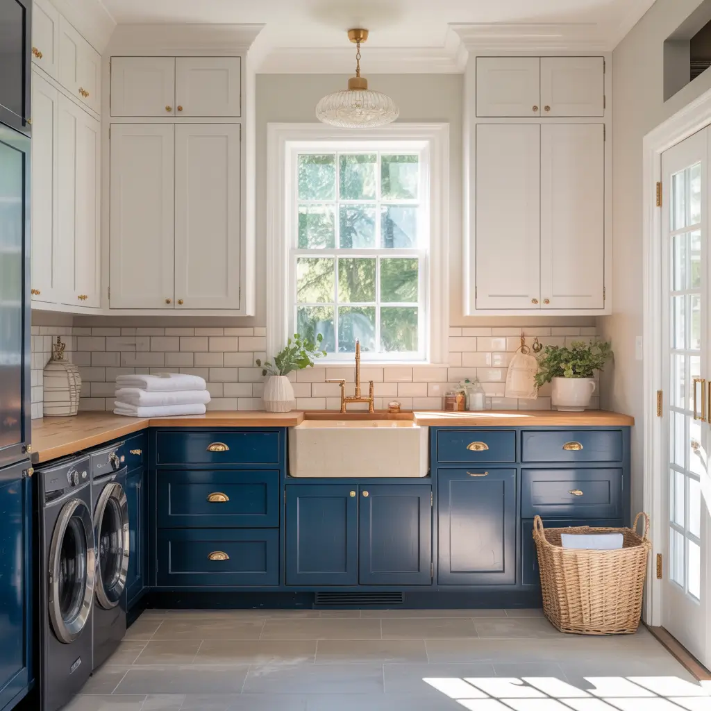 Remember when everything had to match perfectly? Yeah, those days are gone, and thank goodness for that! Two-tone cabinets bring personality to your laundry room without screaming “look at me!”