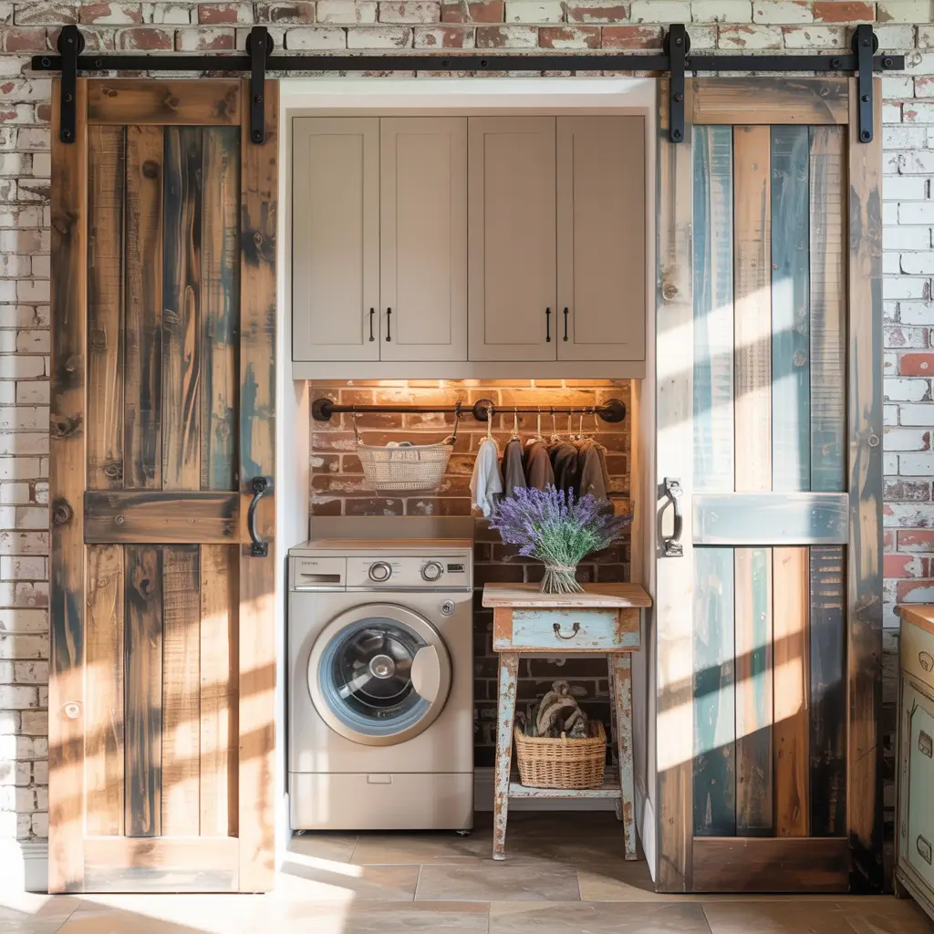 Who says barn doors are just for bathrooms? Sliding barn doors on laundry cabinets add instant character and solve the annoying problem of cabinet doors that swing into your workspace.