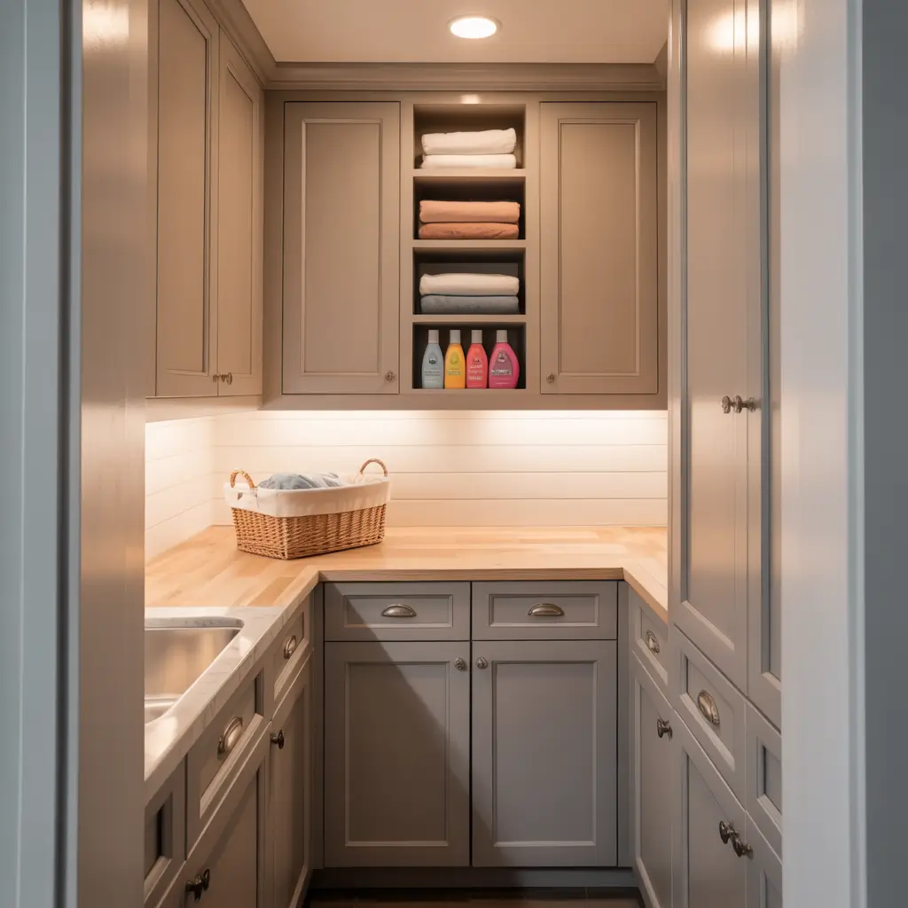 You know what’s funny? We spend thousands on kitchen cabinets but somehow think a single shelf above the washer counts as laundry room storage.