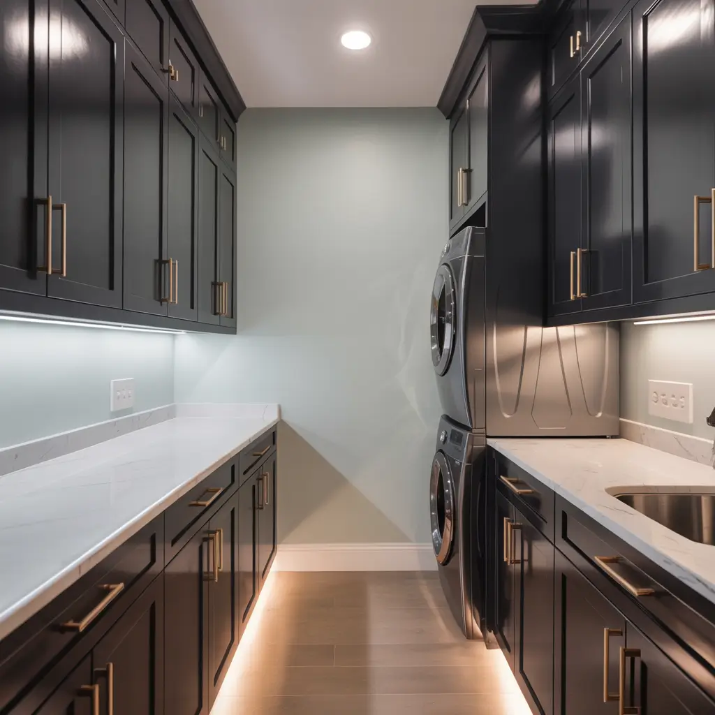 I was skeptical about dark cabinets in a utility space, but after seeing them at a design show, I was sold. The dramatic contrast against white walls and appliances creates this high-end look that costs way less than you’d think.