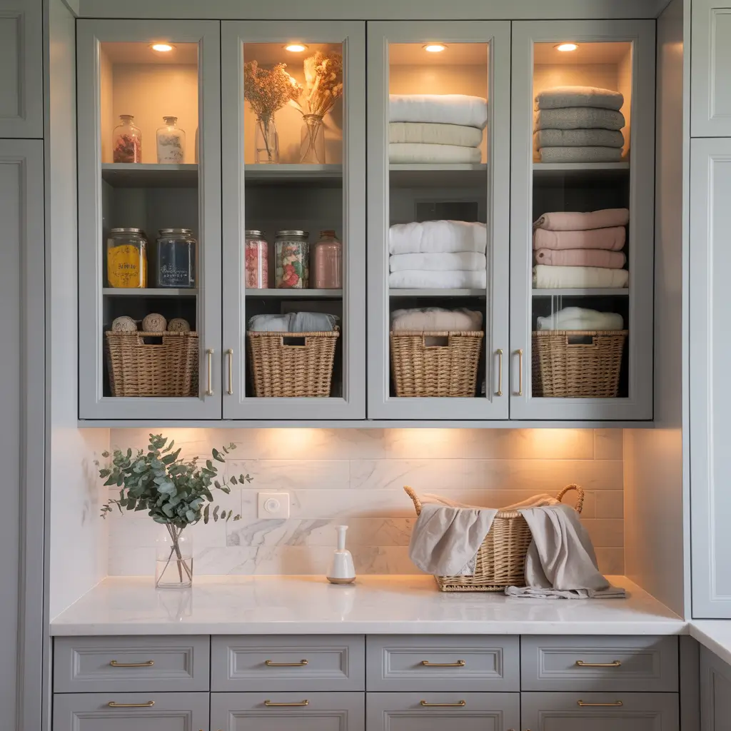 Who says laundry rooms can’t be pretty? Glass-front cabinets let you show off those aesthetic storage containers and matching towels you bought. It’s functional storage that doubles as decor!