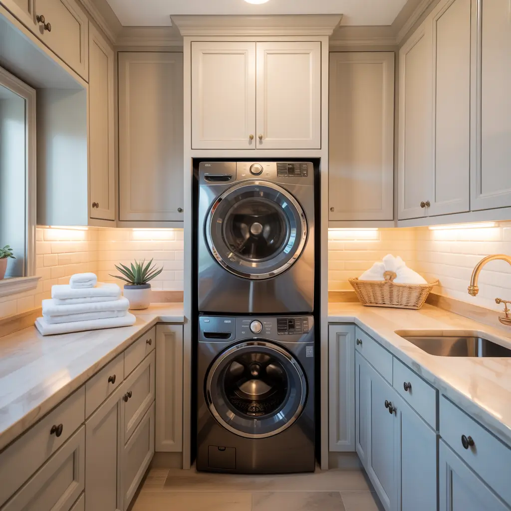 Here’s where things get really clever. Built-in cabinets that wrap around your appliances create this seamless, custom look that makes your laundry room feel like it was designed by professionals. Spoiler alert: you can totally DIY this!