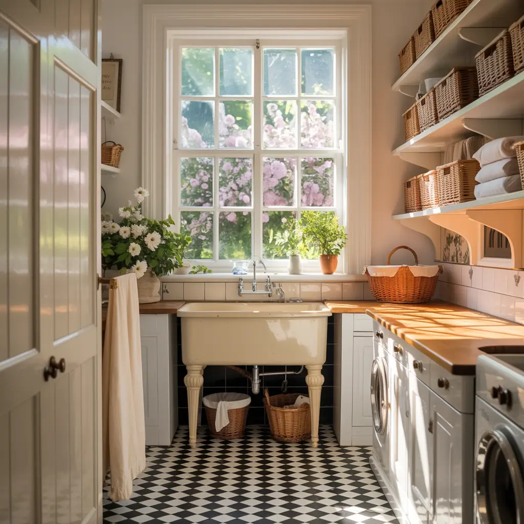 Nothing says “I’ve got my life together” quite like classic checkered tiles. This timeless pattern works whether your home screams Victorian charm or modern minimalism. The contrast creates visual interest that makes even a tiny laundry closet feel intentional and designed.