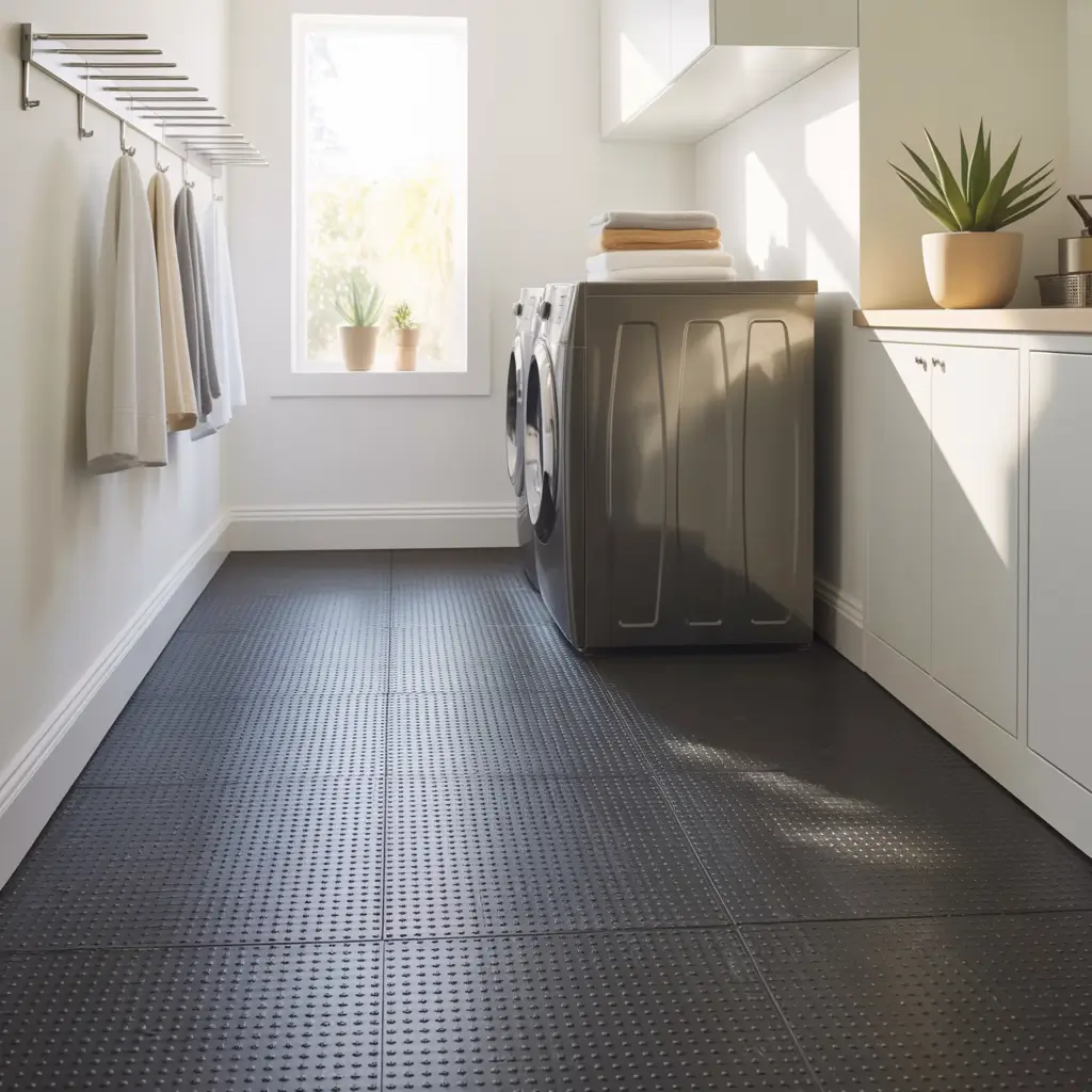 Think beyond basic black mats. Modern rubber flooring comes in tiles, sheets, and even wood-grain patterns. Yeah, you read that right – wood-grain rubber. The world we live in, folks! The texture provides grip even when wet, which matters when you’re carrying a basket of clothes and can’t see your feet.
