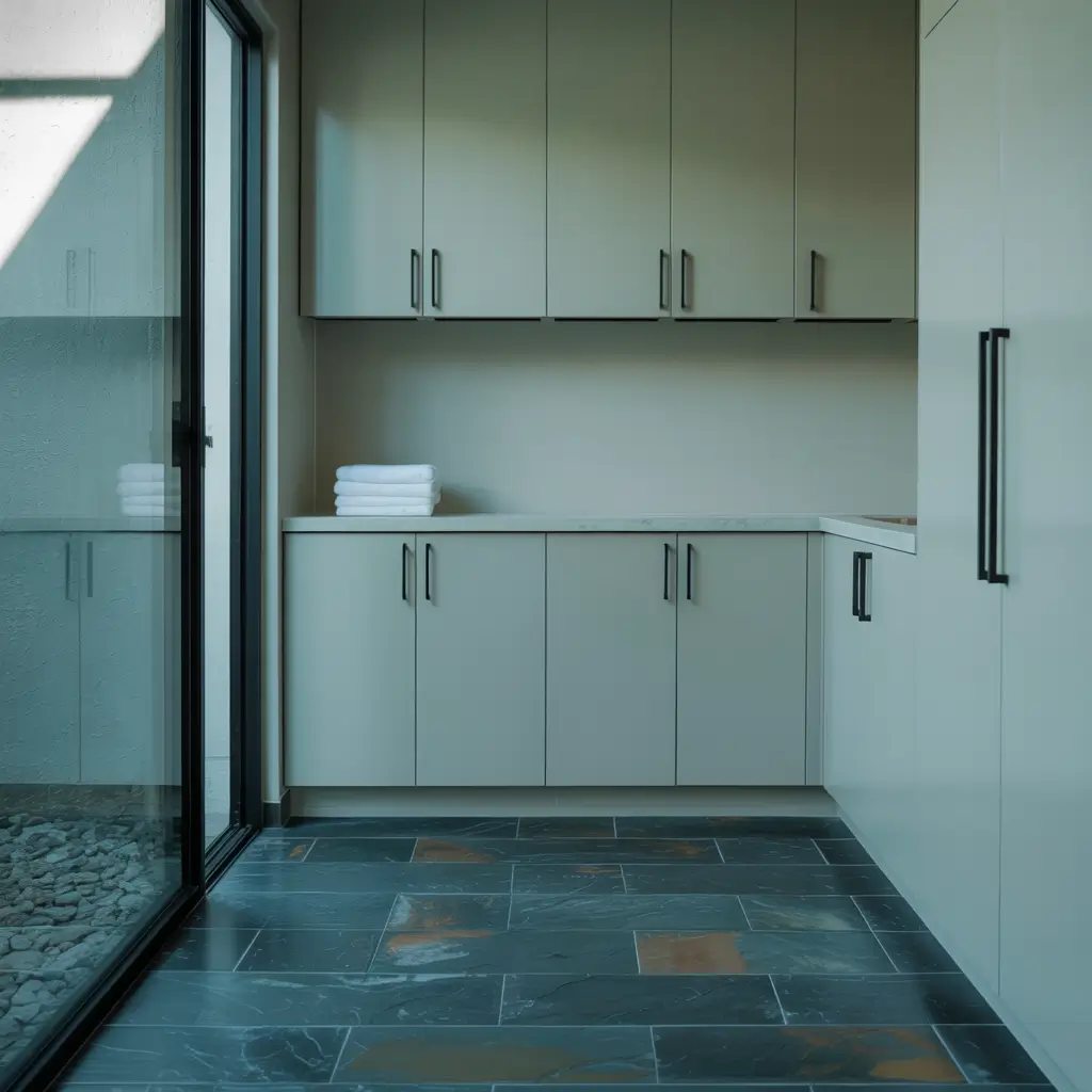 Sometimes you just want something clean, simple, and timeless. Grey slate tiles deliver that minimalist aesthetic while being tough enough to handle whatever your laundry routine throws at them. The natural cleft surface provides slip resistance without looking too rustic.
