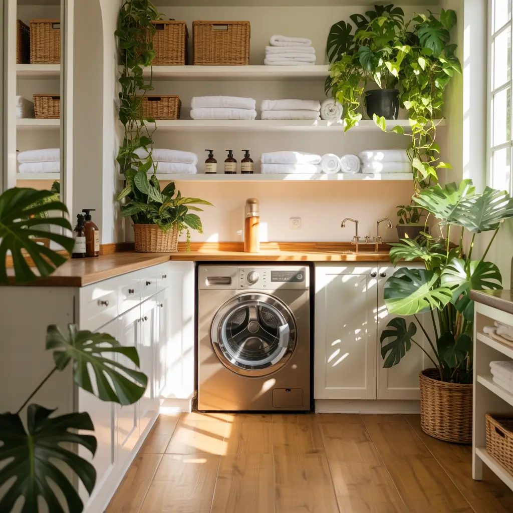 The light, natural color brightens up typically dark laundry spaces, and the subtle grain pattern adds interest without overwhelming. Bamboo costs less than traditional hardwood but delivers similar aesthetic appeal. Mother Earth approves, and so does your budget.