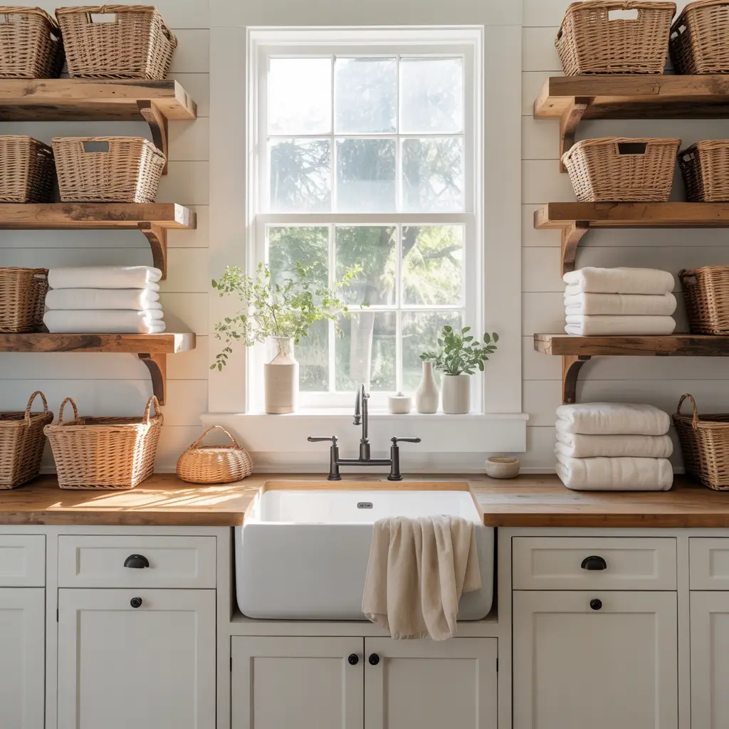 Open shelving in the laundry room? Absolutely! It’s not just for kitchens anymore. I was skeptical at first – wouldn’t everything get dusty? But open shelves actually forced me to stay organized.