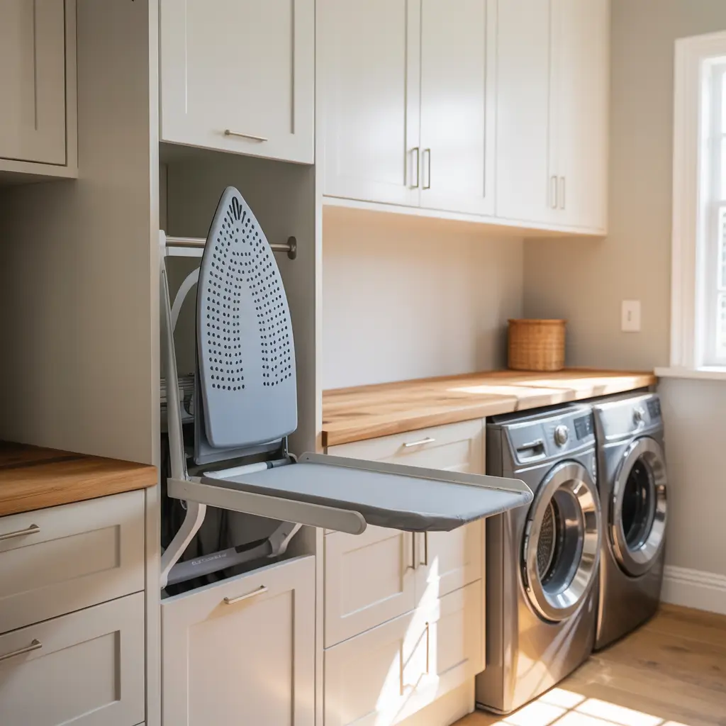 Mine is installed at hip height and includes a small shelf above for the iron and spray bottle. When I need to iron (which, let’s be honest, isn’t often), it takes two seconds to fold down. When I’m done? Back up it goes, like it was never there.