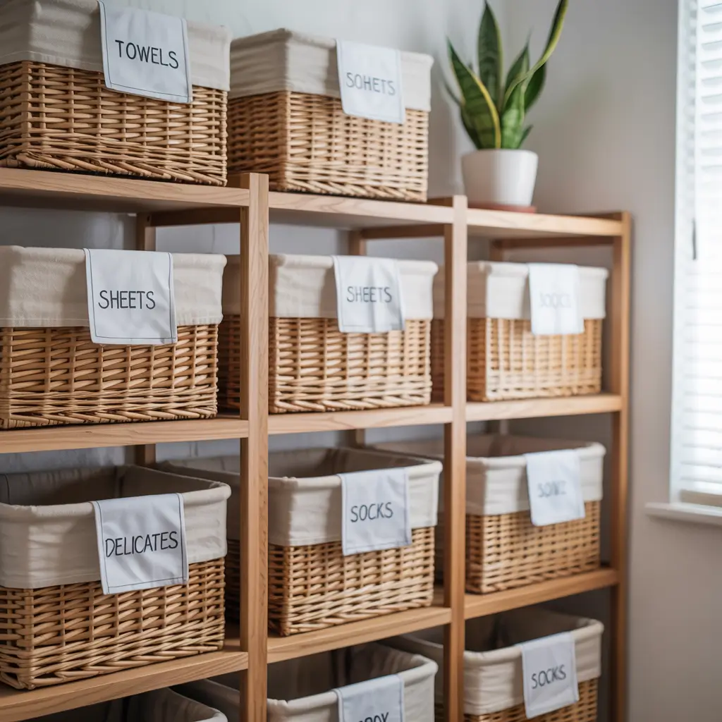 I use white canvas baskets throughout my laundry room – they’re affordable, washable, and look way more expensive than they are. Each basket has a purpose: one for stain removers, one for lint rollers and fabric shavers, one for miscellaneous supplies.