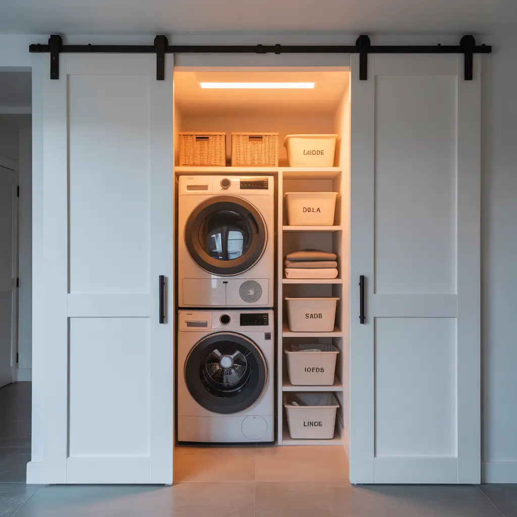 If your laundry area is in a hallway or shared space, sliding doors can be a total game-changer. Barn doors or pocket doors hide the chaos when you’re not actively doing laundry (which is most of the time, thankfully).