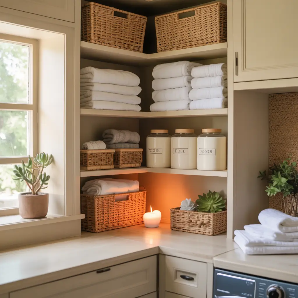 I installed triangular corner shelves in my laundry room, and suddenly that dead space became useful. The shelves hold everything from extra toilet paper (hey, storage is storage) to backup cleaning supplies.