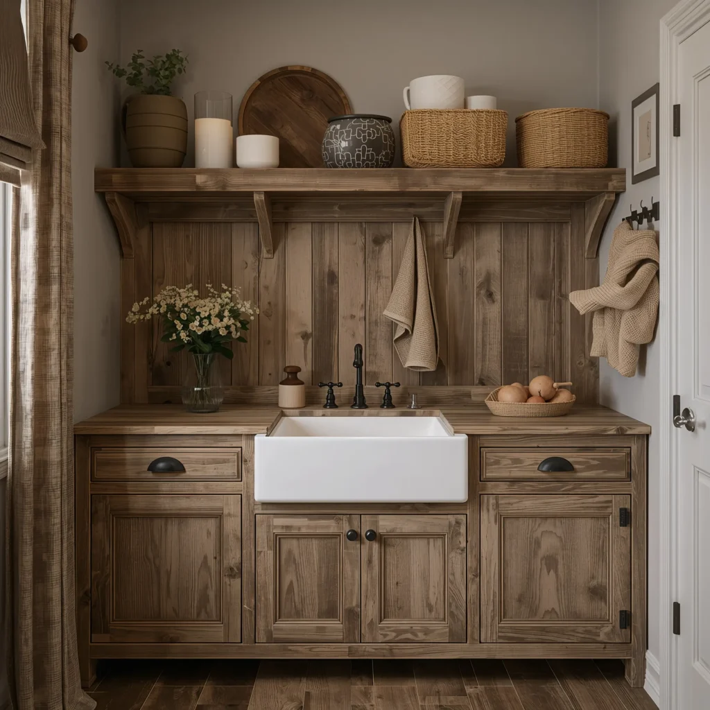 What surprises people is how practical these rustic setups can be. The wood provides plenty of counter space for folding or sorting, and those chunky cabinet doors hide all your cleaning supplies beautifully. Just make sure to seal the wood properly – laundry rooms get humid!