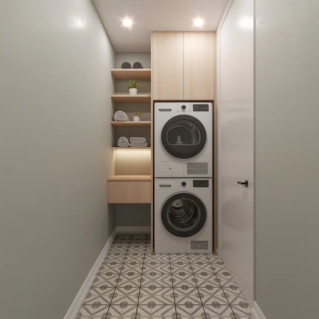 In my friend’s laundry room, we installed grey stone-look tiles on the floor and added floating wood shelves above. The contrast between the cool tiles and warm wood creates this perfectly balanced space that feels both functional and inviting.