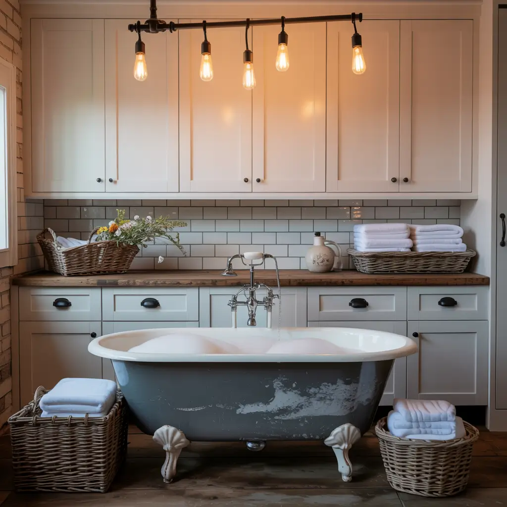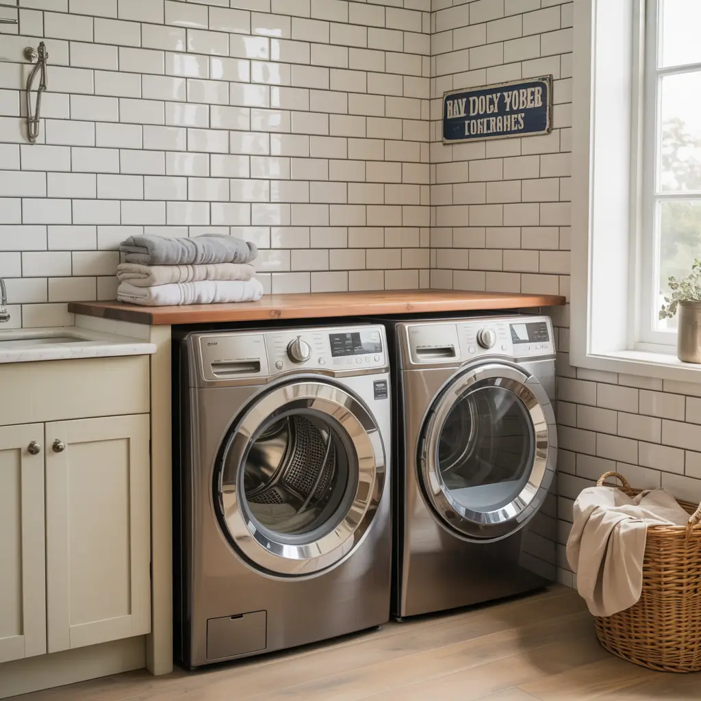 My favorite farmhouse trick? Using white square tiles in a brick pattern instead of traditional subway tiles. It gives you that same clean look but feels a bit more unique. Pair it with a butcher block countertop over your washer and dryer, and you’ve got Instagram-worthy laundry room goals.