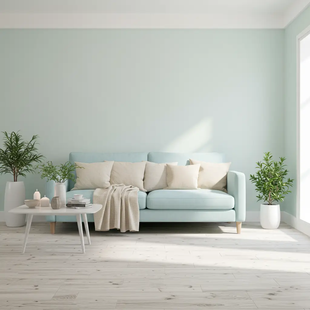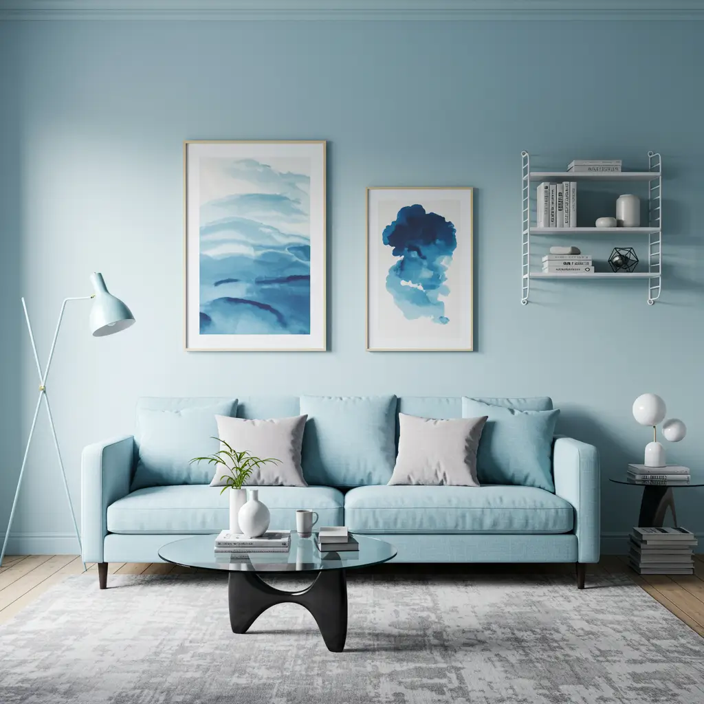 Light blue recedes visually rather than advancing like warm colors do. It makes walls feel farther away and ceilings feel higher. Your couch becomes a soft focal point rather than a space-eating monster.