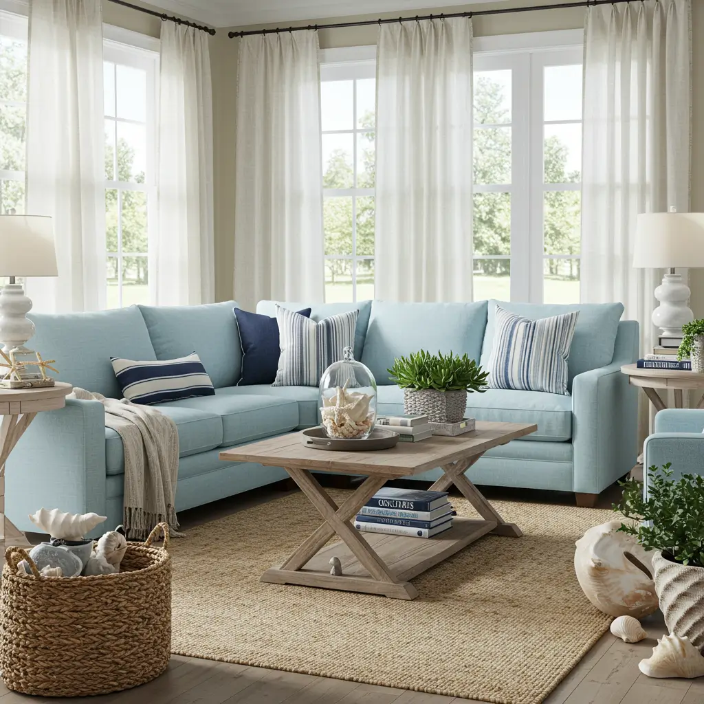 The trick to coastal style that doesn’t feel forced? Restraint with the obvious beach elements. Choose one or two subtle nods — maybe a piece of coral as sculpture or a large photograph of waves. Your light blue couch provides all the ocean reference you need.