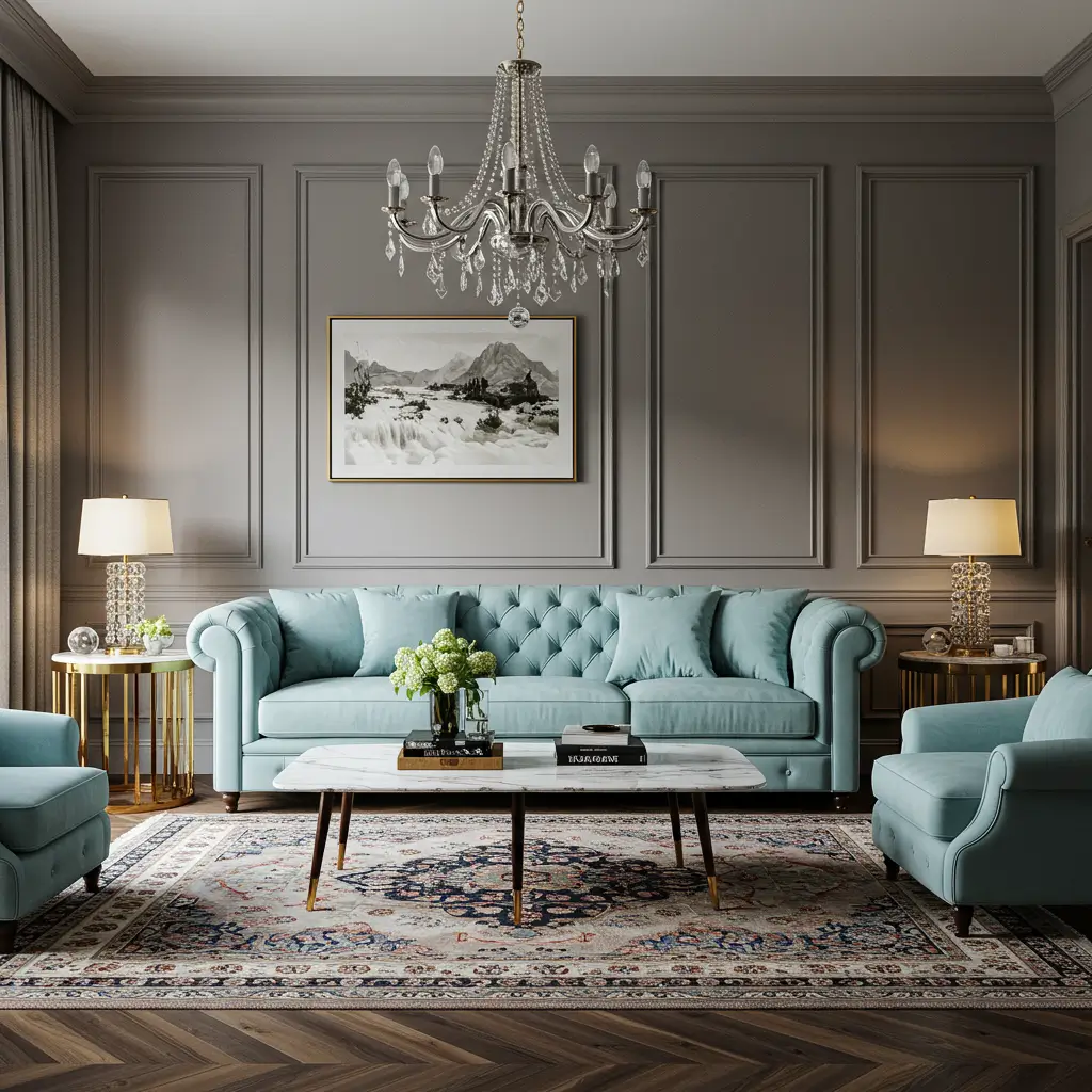 Light blue and traditional elegance go way back — think French salons and English drawing rooms. A classic setup around your light blue couch creates timeless sophistication that never goes out of style.