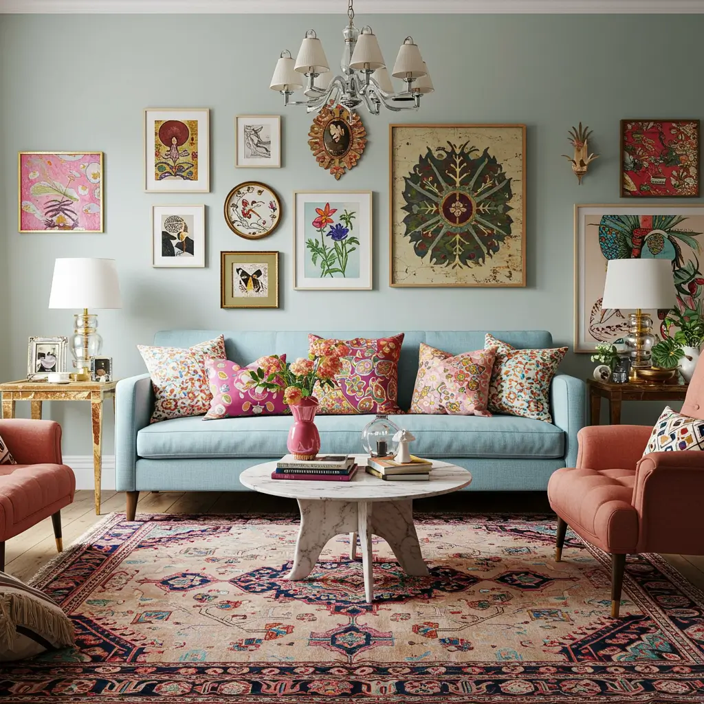 Ever noticed how maximalist rooms can feel overwhelming? The cool tone of light blue actually helps balance all that visual stimulation, making the space energizing rather than exhausting.