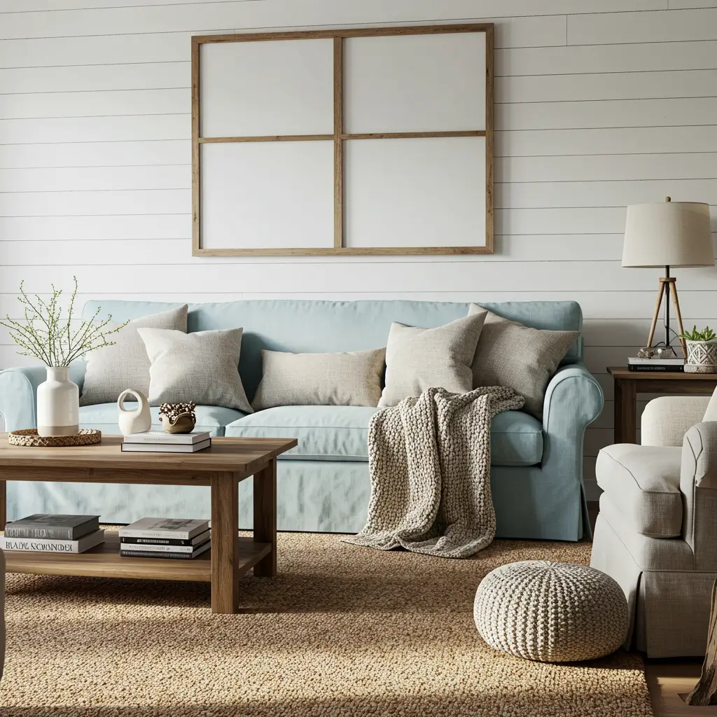 Your light blue couch modernizes the farmhouse look instantly. It prevents the space from feeling too predictable or Pinterest-generic. Pair it with traditional farmhouse elements, and suddenly your room looks custom-designed rather than catalog-copied.