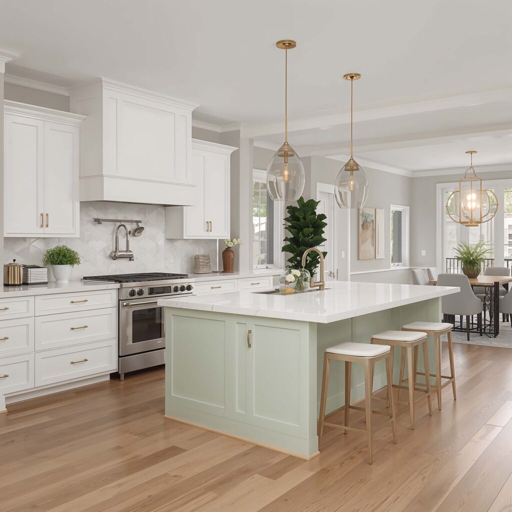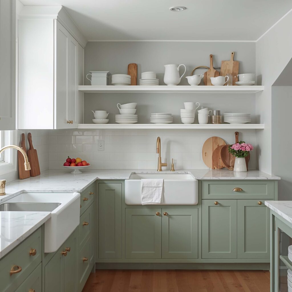 I’ve seen this done brilliantly with white uppers and light green lowers, and it’s genius. The white keeps things bright and airy while the green adds personality without overwhelming the space. Plus, it’s way less commitment than going full green.