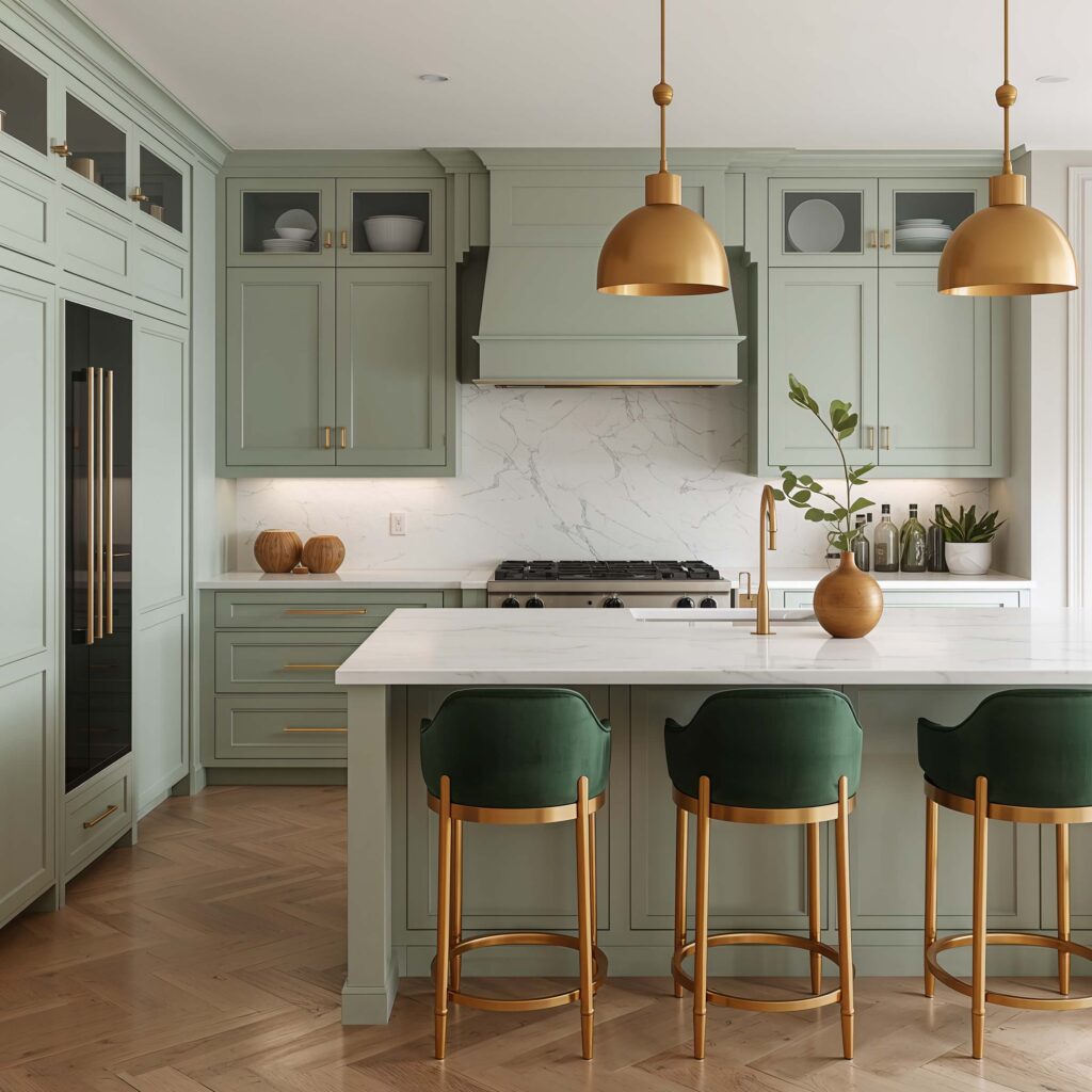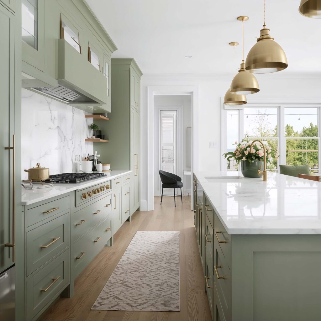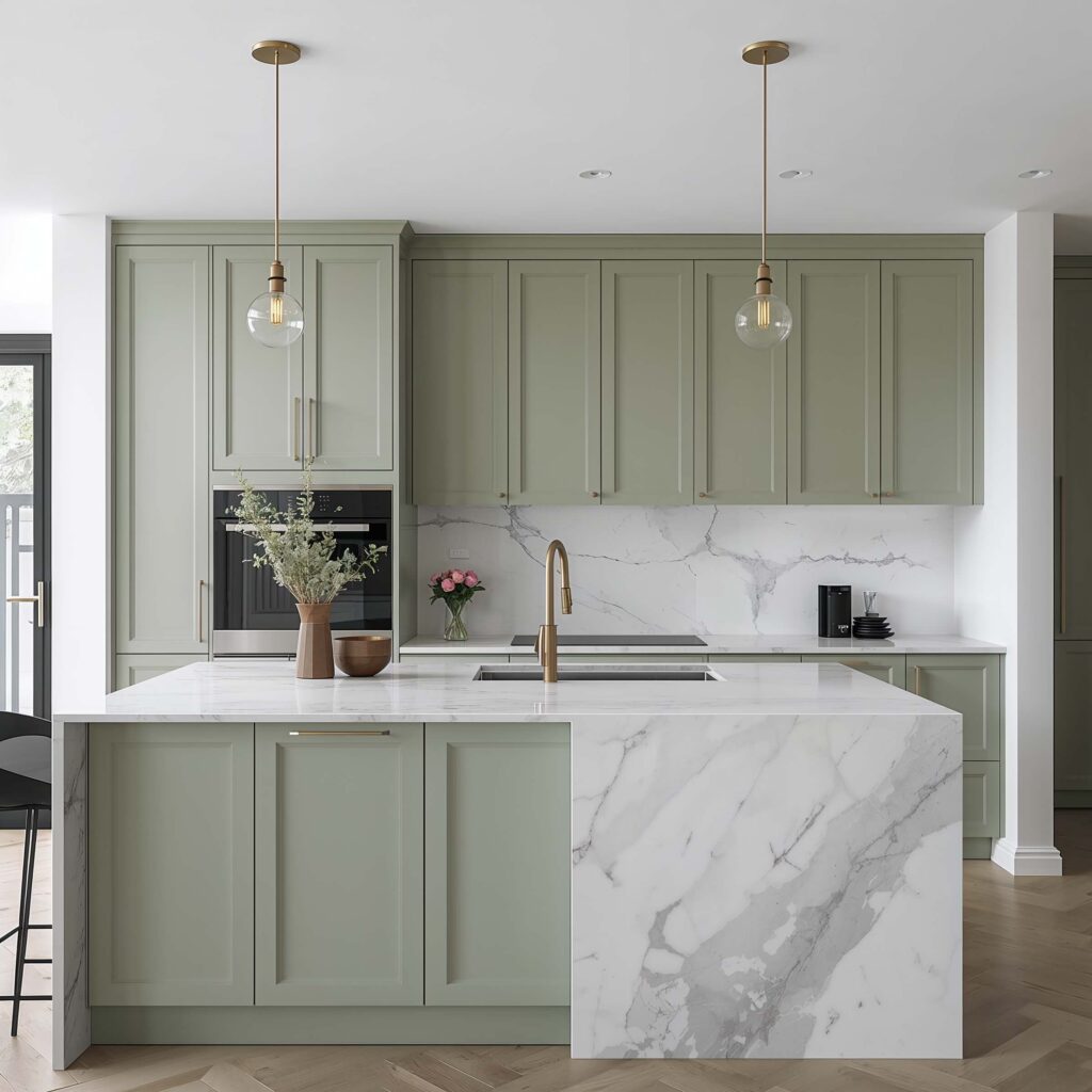 I installed green-veined white marble in my powder room (couldn’t afford it for the whole kitchen :/), and it’s become everyone’s favorite feature. The soft green veining ties in beautifully with any green cabinet or backsplash choice.