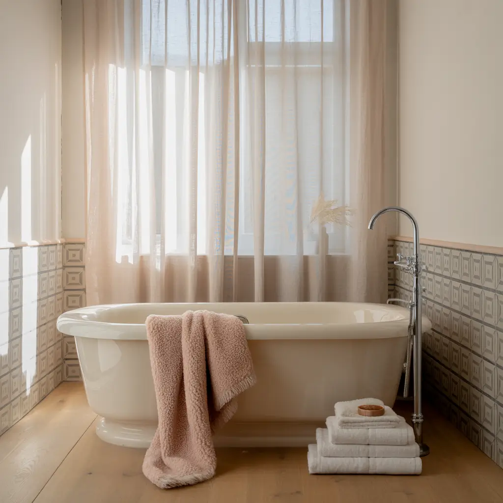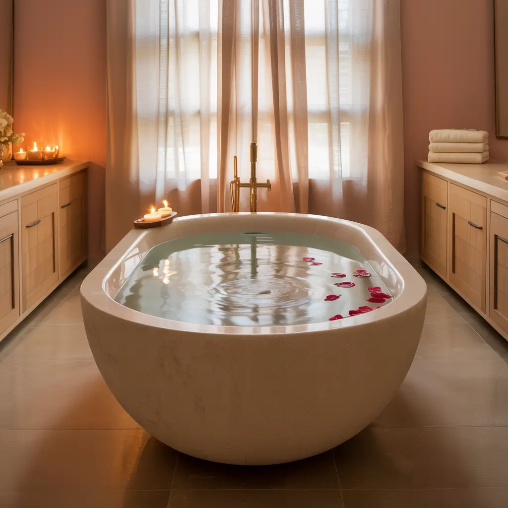 The best part about this look is how it plays with light. Natural sunlight makes the pink tones practically glow, while evening lighting creates this cozy, intimate vibe that’s perfect for those long bubble bath sessions we all pretend we have time for.