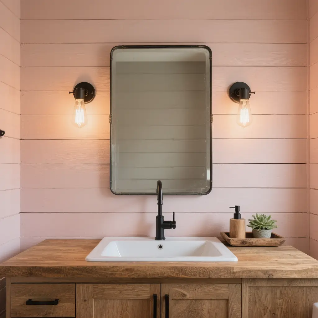My neighbor just finished a modern farmhouse bathroom with dusty pink shiplap walls, and I might be a little obsessed. The pink plays perfectly with the black fixtures and white countertops, creating this balanced, magazine-worthy space.