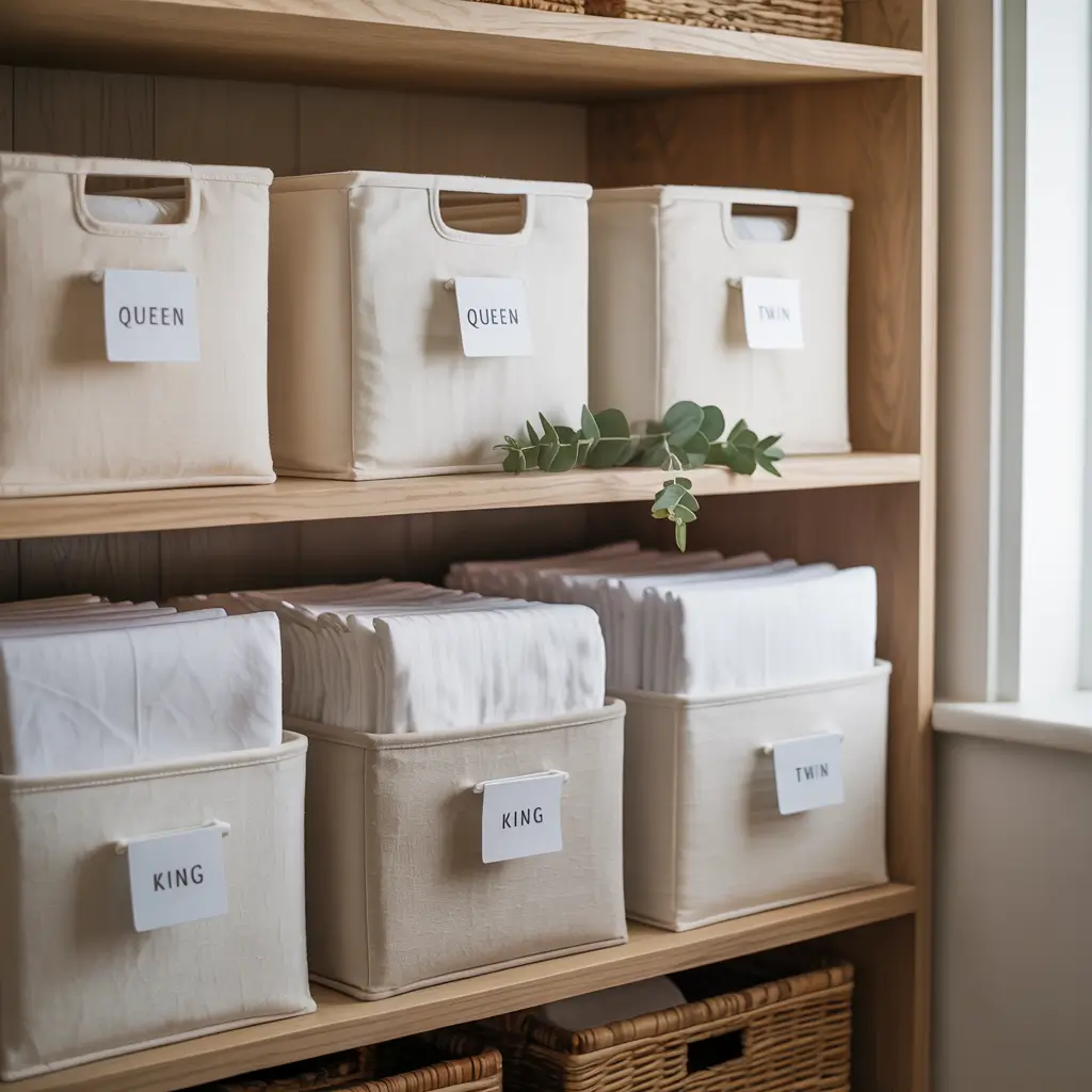 Each bundled set goes into a fabric bin labeled by bed size. King sheets in the gray bin, queens in the navy one, twins in the white basket. No more frankenstein sheet sets where nothing matches because you grabbed from three different places. Everything for one bed lives together in its little pillowcase bundle.