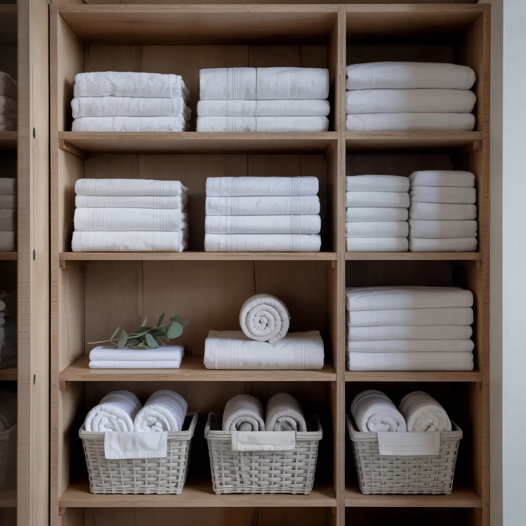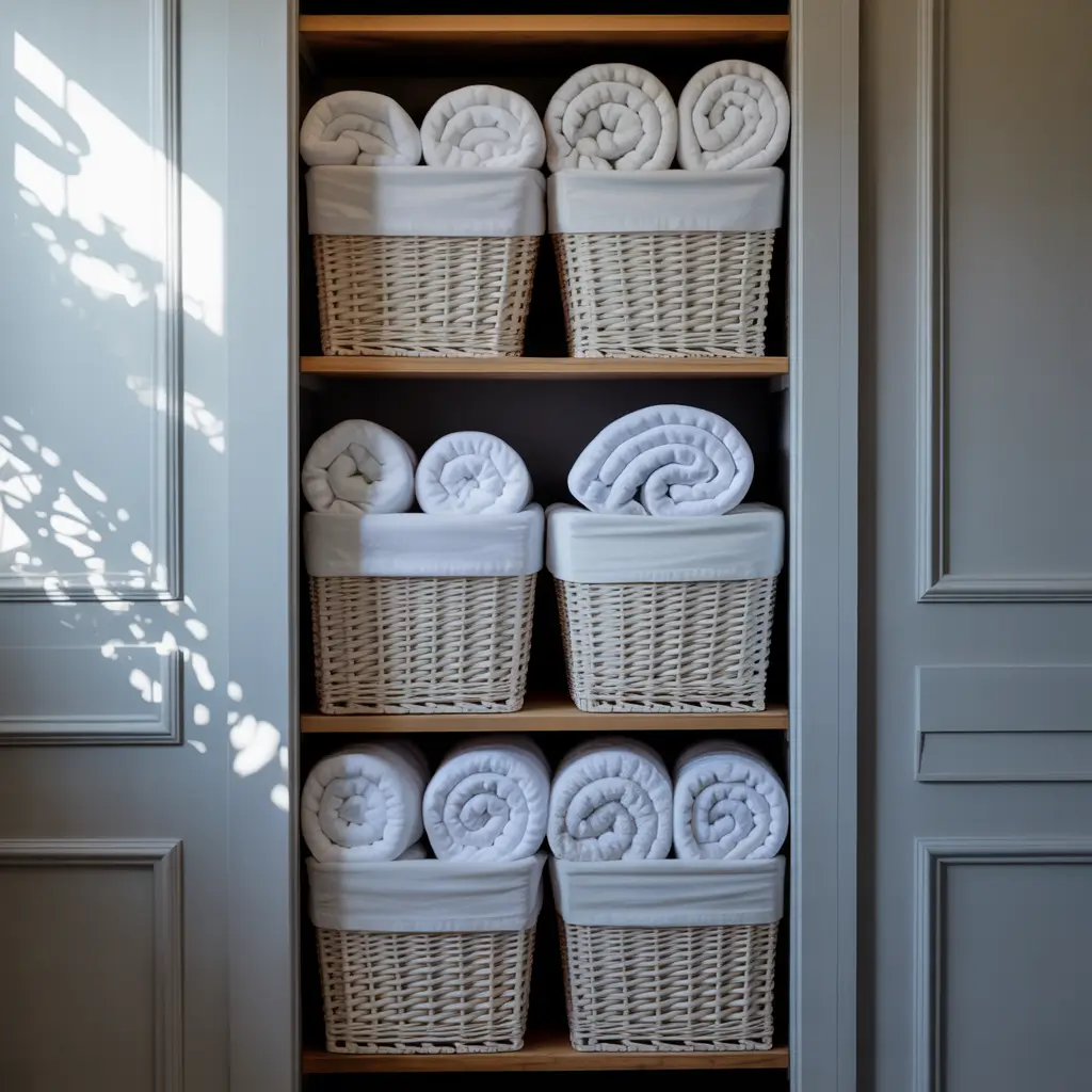 My trick? I use a shallow basket or bin to corral the rolls. Otherwise, they tend to unroll and create chaos. The basket keeps everything contained while still showing off that spa vibe. Is it extra? Maybe. Do I smile every time I open the closet? Absolutely.