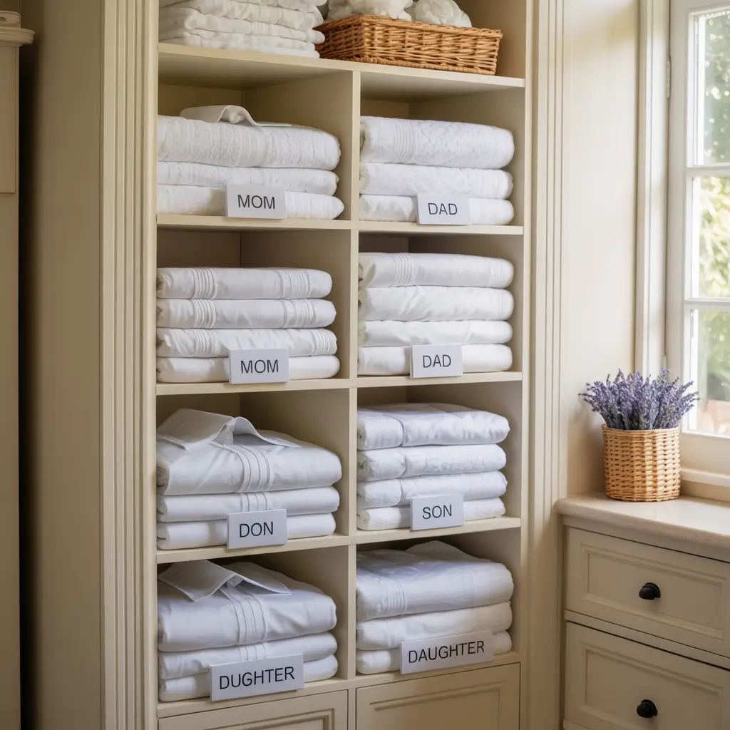 I divided our closet vertically – left side for adults, right side for kids. The kids’ sections are lower so they can reach their own towels and sheets. Each person’s zone has their bath towels, hand towel, washcloth, and spare sheet set. No more “Mom, where’s my towel?” at 6 AM.