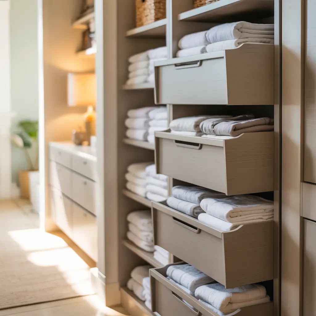 The fabric bins stack beautifully on my linen closet shelves, and I can pull out exactly what I need without disturbing the rest. Want to know the unexpected bonus? This method actually saves space compared to my old “stack and pray” approach.