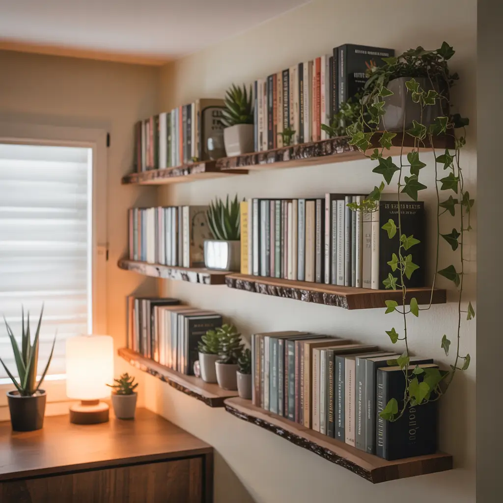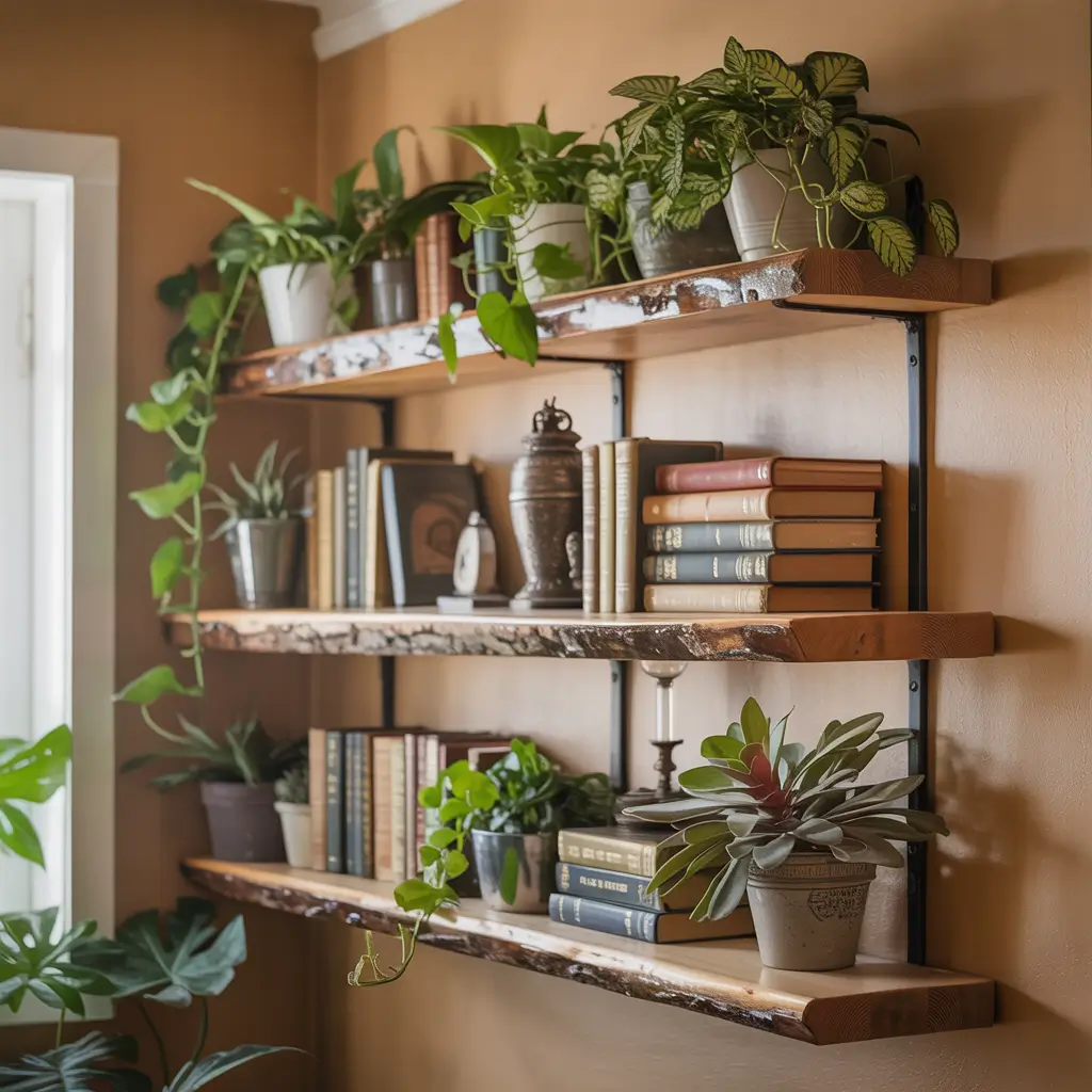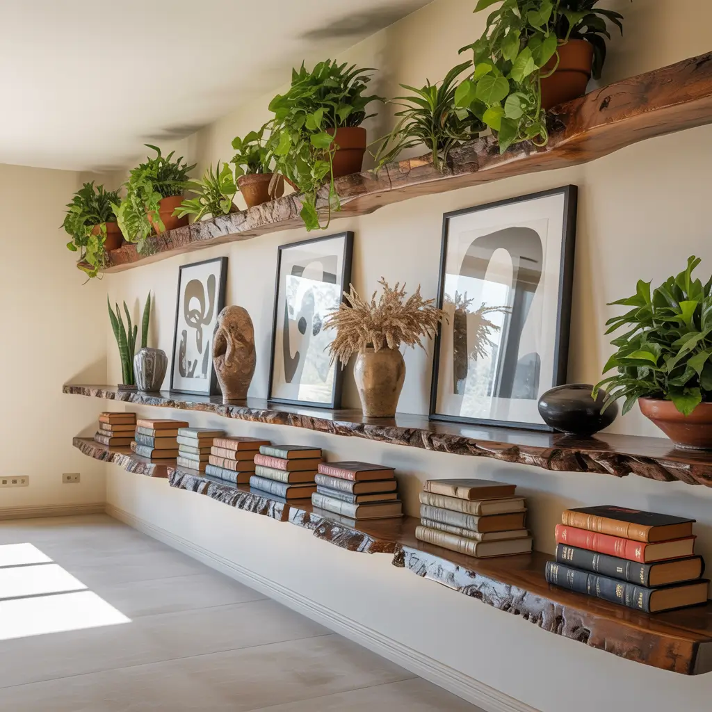 Floating live edge shelves bring instant character to any room. I installed three walnut slabs in my living room, and they make even my random collection of books look like an intentional display. The natural edge creates this amazing organic line that softens the typical harsh angles of interior spaces.