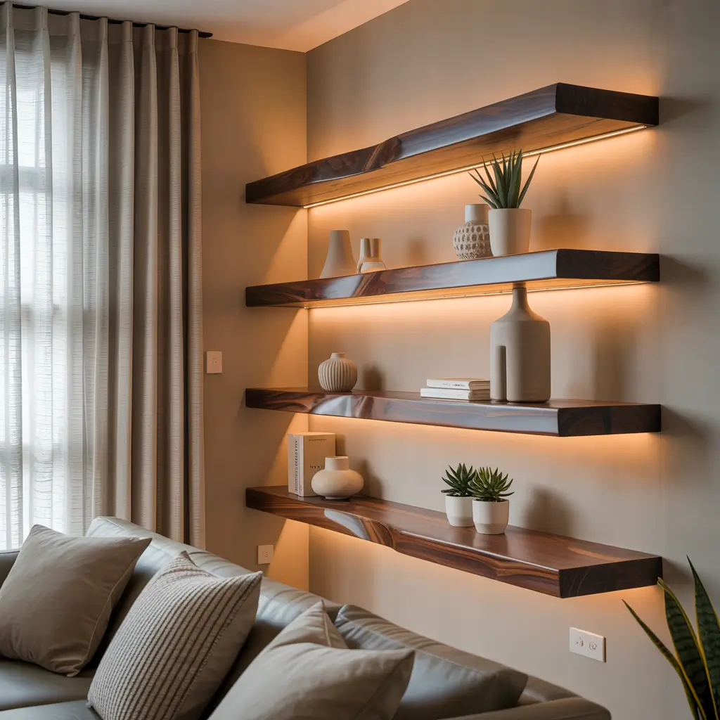 Adding lighting to live edge shelves creates magical effects. My bedroom shelves feature LED strips that wash light across the natural edges, creating amazing shadows and highlighting wood grain patterns.