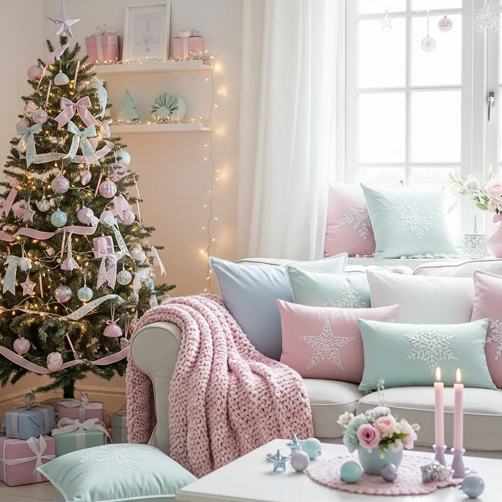 Keep pastels Christmas-appropriate by mixing in metallics, adding plenty of greenery, and including traditional shapes like stars and trees. The forms say Christmas while colors whisper it.