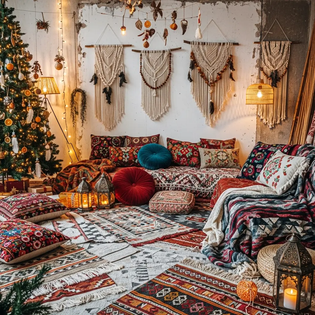 Bohemian Christmas style celebrates texture, pattern, and collected treasures. This eclectic approach creates a living room that feels personally curated rather than store-bought.