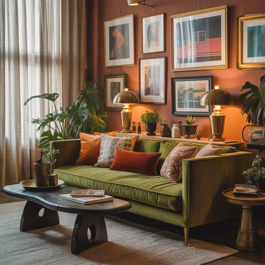 I use color as my unifying element. Everything in my living room includes some shade of green – forest green velvet chair, sage throw pillows, emerald glass vases, mint ottoman. The color repetition creates cohesion among furniture from different decades and styles. You could also use material (all wood pieces) or era (all mid-century) as your common thread.