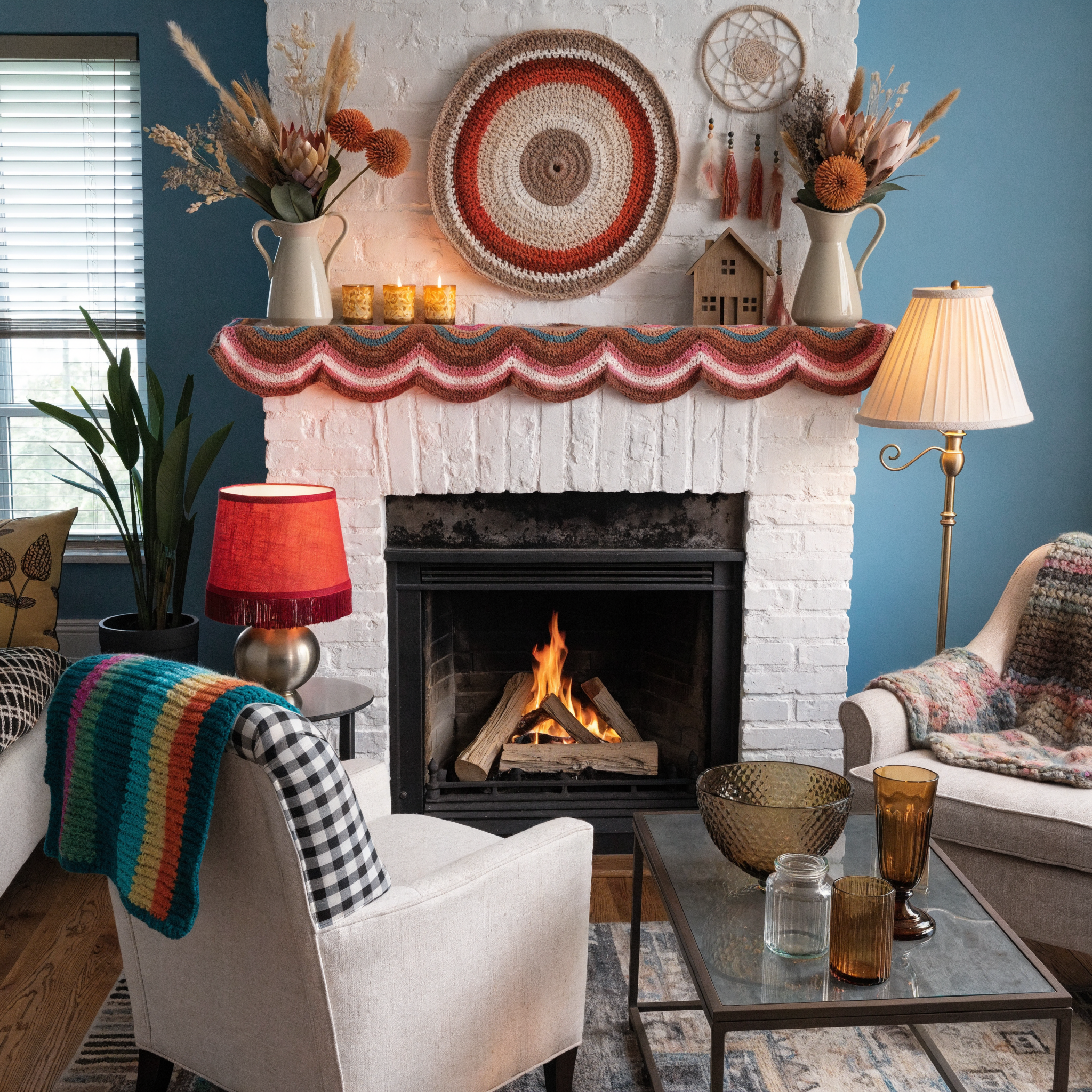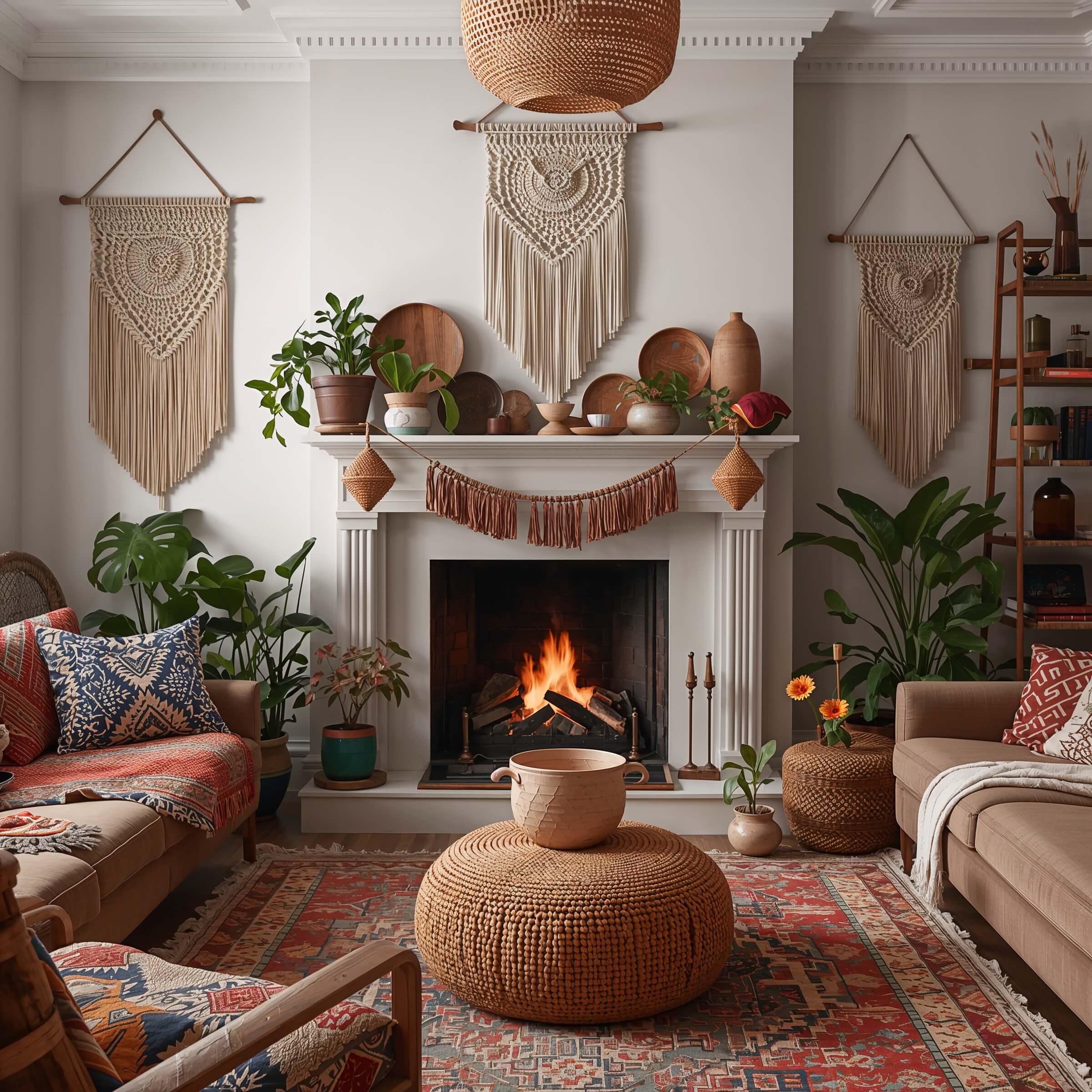 Boho decor thrives on texture. Layer different materials so the fireplace feels relaxed and lived-in.