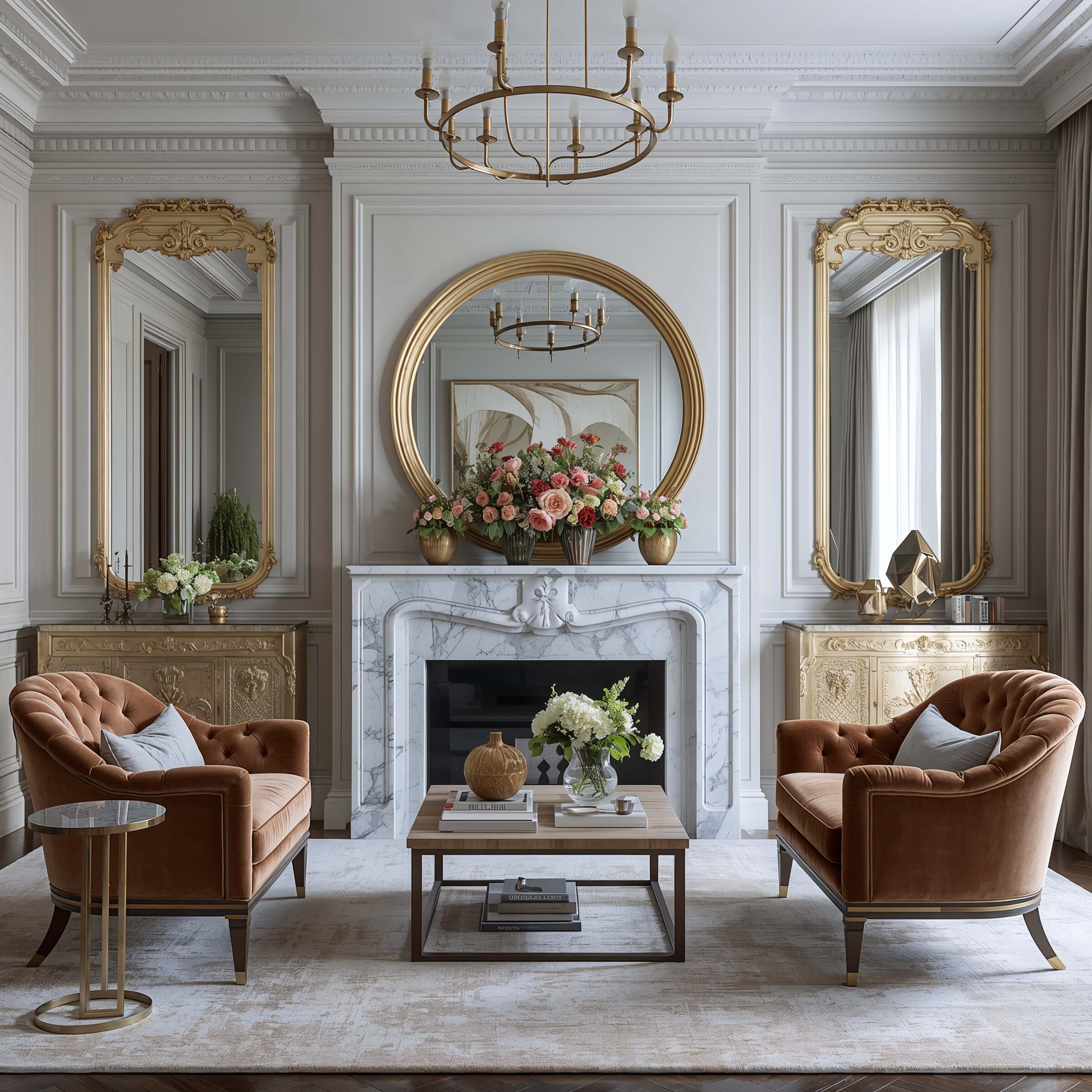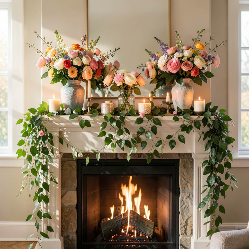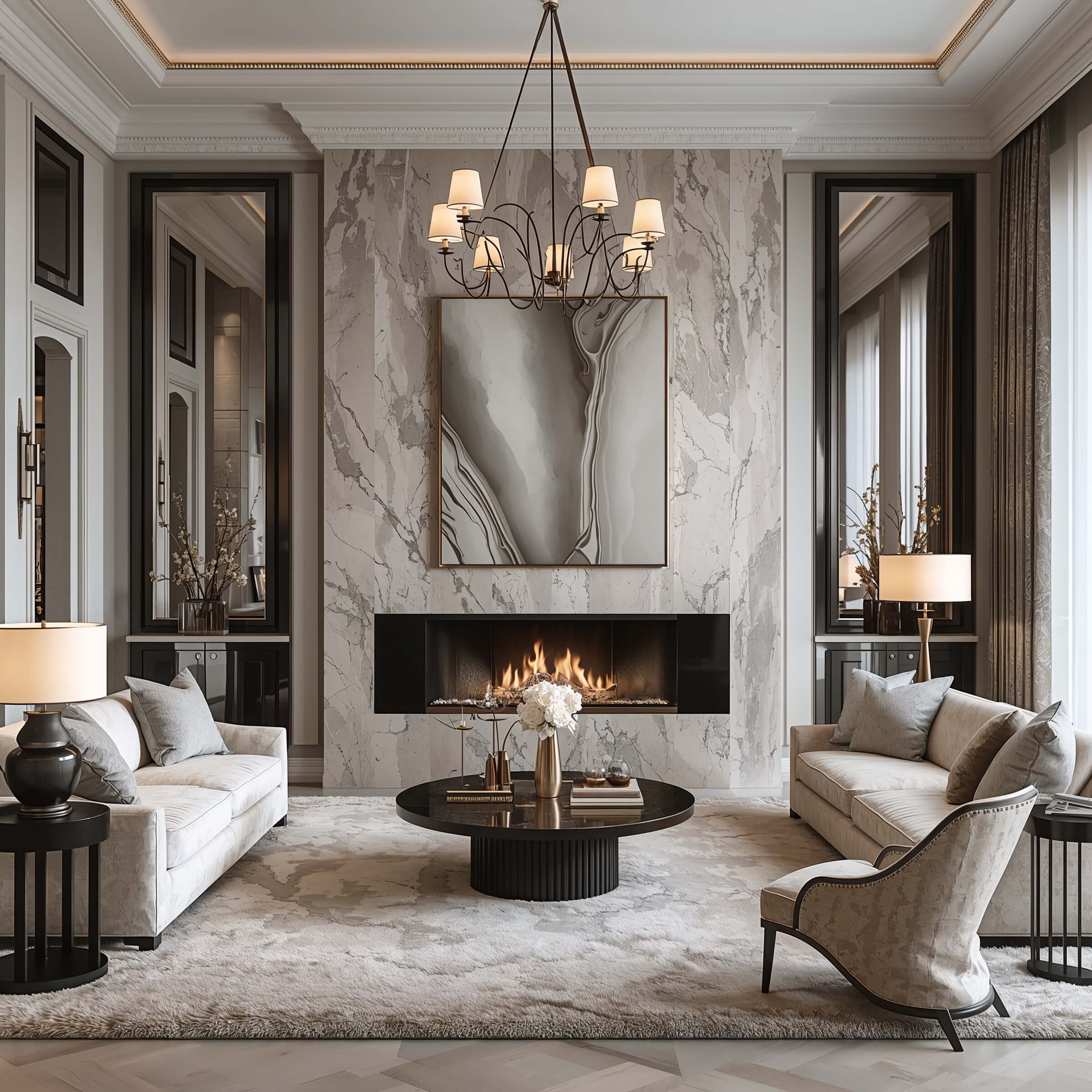 Symmetrical styling works especially well with elegant marble fireplaces. It feels clean, balanced, and timeless.