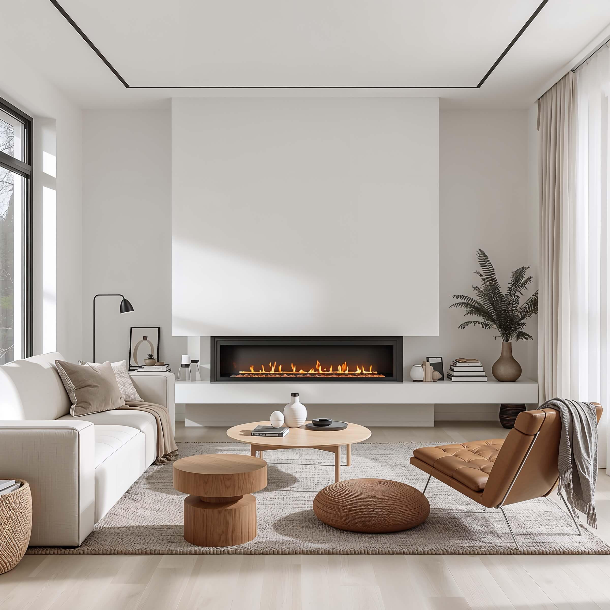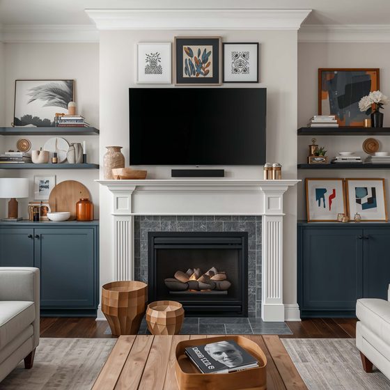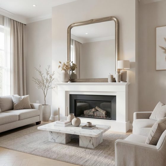 Minimalism doesn’t mean empty. It means every piece needs to earn its spot. Add one large framed print, a sculptural vase, or a simple mirror above the mantel.