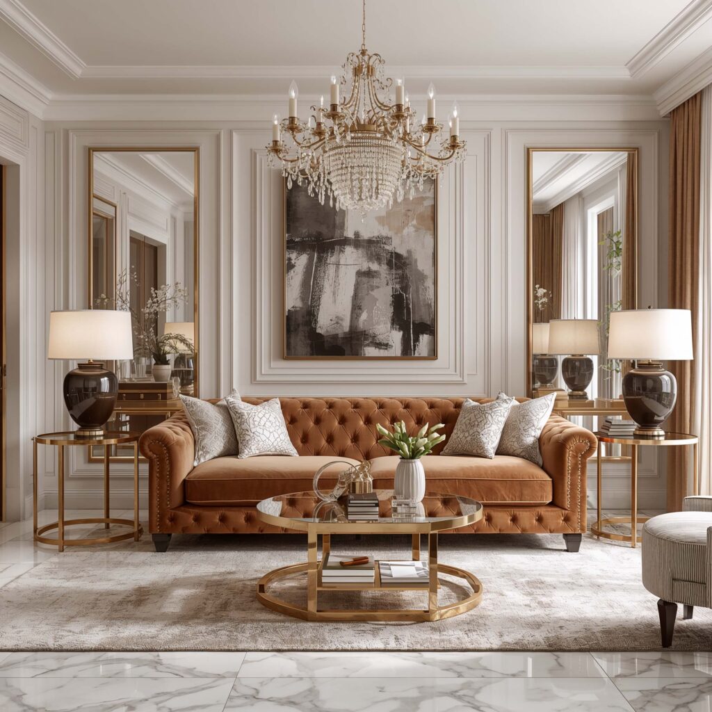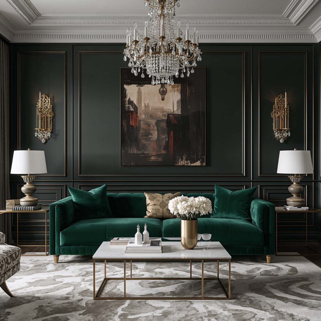 Jewel-toned velvets make the biggest impact: emerald green, sapphire blue, deep plum. These colors look expensive even when they’re not. Pair velvet furniture with sleek metal accents and glass surfaces to keep things modern rather than Victorian.
