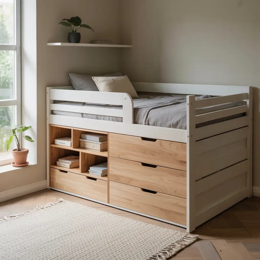 Let’s talk about the holy grail of small room solutions: loft beds with integrated storage. These babies make every cubic inch of your room work overtime. We’re talking drawers in the stairs, shelves in the frame, and cubbies everywhere else.