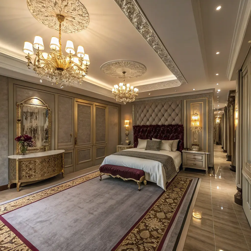 Start with a statement headboard that extends to the ceiling – this draws the eye up instead of down the length of the room. Add a chandelier or dramatic pendant light about two-thirds down the room to create a second focal point. This breaks up the tunnel effect while adding serious glamour.