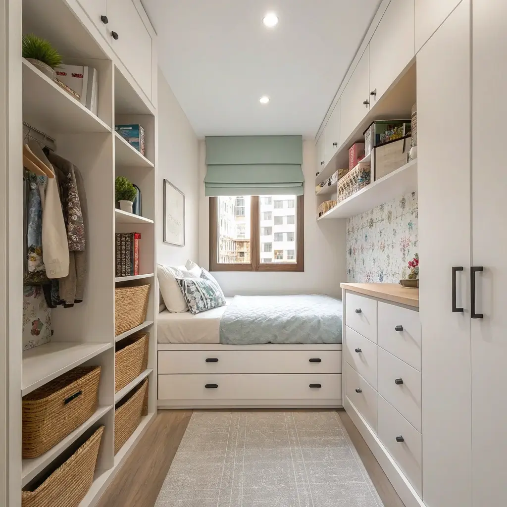 Storage in a long, narrow bedroom feels like trying to pack a suitcase that’s three feet long but only one foot wide. Everything wants to stack up along those precious short walls, leaving the long walls looking bare and useless.