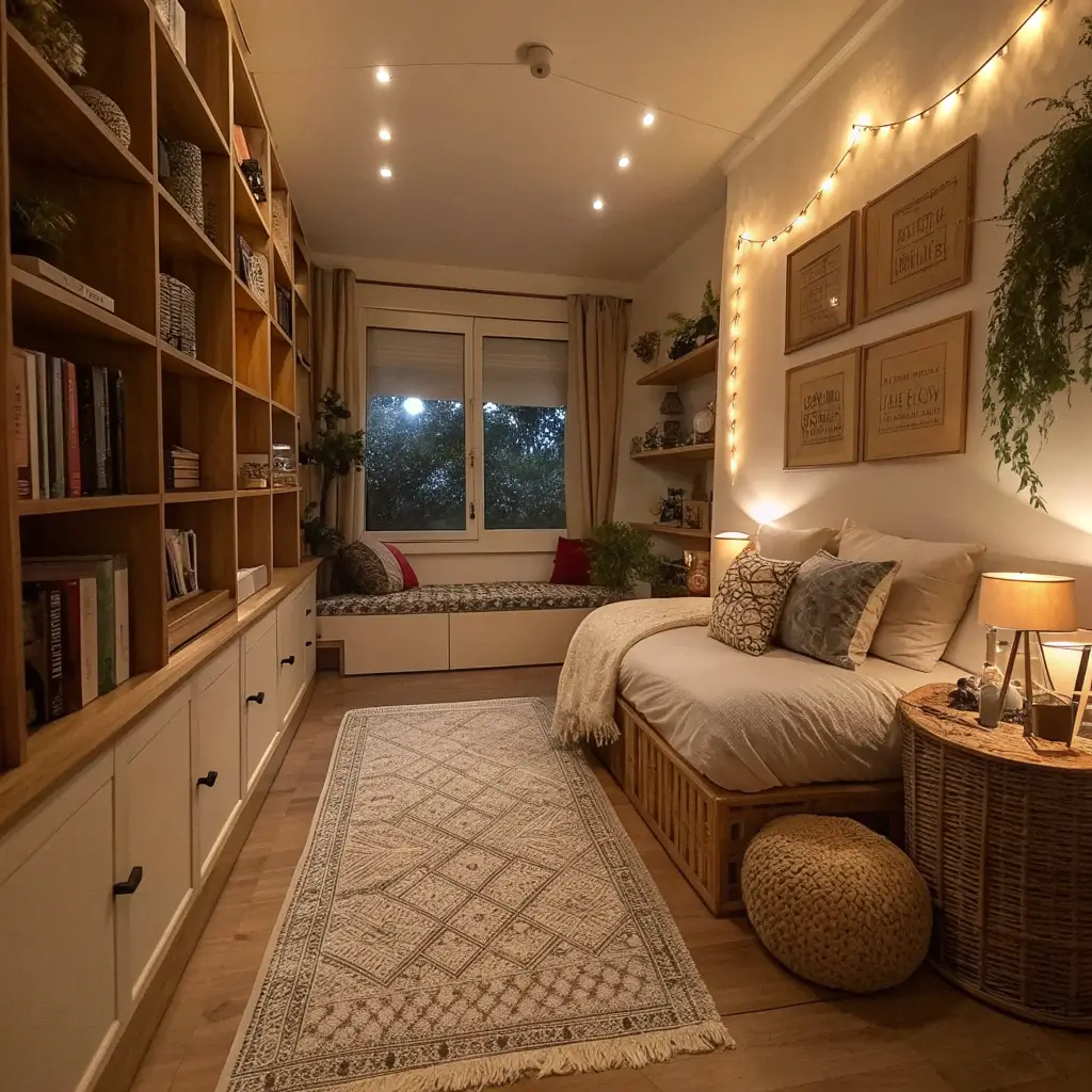 Instead of pushing your bed against the short wall, try angling it diagonally in one corner. This breaks up those long sight lines and creates interesting negative space. Your room instantly feels less like a tunnel and more like an actual bedroom.