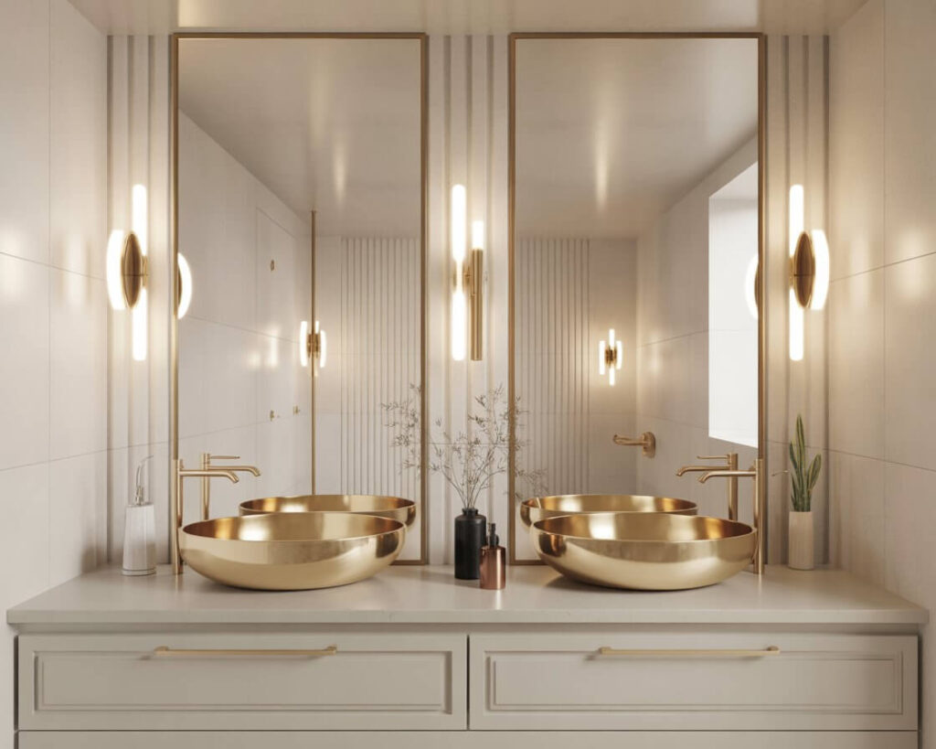 Metallic finishes add instant glamour without overwhelming the space. I mix metals constantly – brass mirrors with chrome faucets, copper vessels with gold hardware. The old “match everything” rule? Totally outdated.