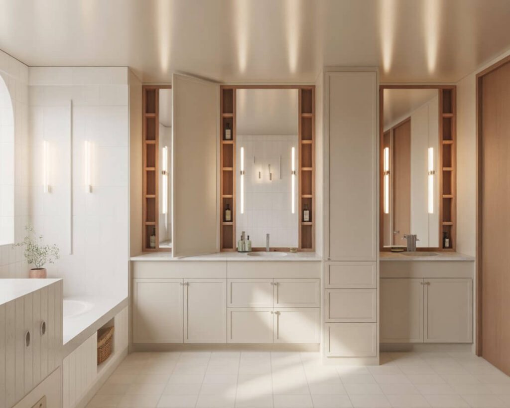 Clutter kills luxury vibes faster than anything else. Hidden storage keeps necessities accessible while maintaining that high-end hotel bathroom aesthetic. I built recessed medicine cabinets behind mirrors and added pull-out drawers in dead spaces – suddenly my bathroom looked twice as expensive.