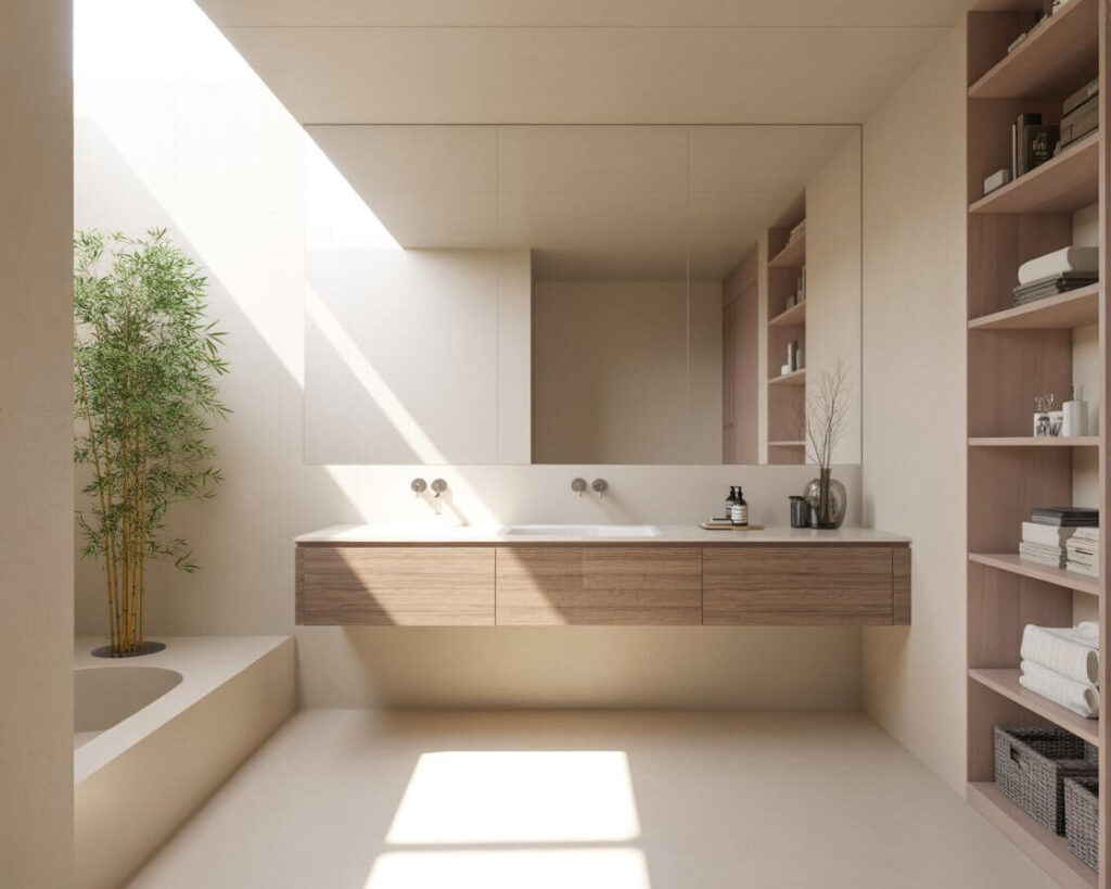 The secret? Every single item needs a purpose and a place. No random bottles cluttering countertops, no unnecessary decorative objects. Just clean lines, natural materials, and breathing room.