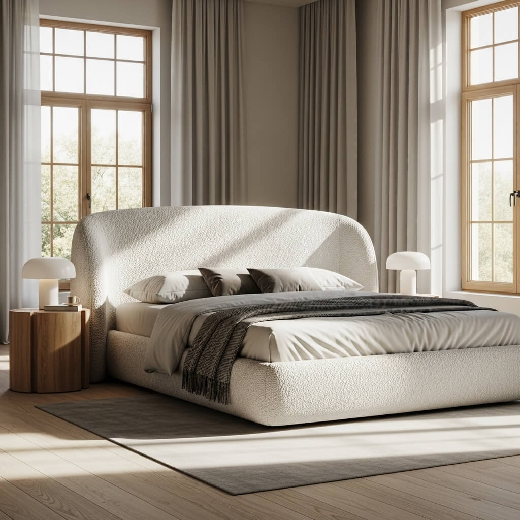 Bouclé fabric is having such a moment right now, and for good reason! This textured fabric with its distinctive looped yarn creates this incredible tactile experience that just screams luxury comfort. When shaped into a curved headboard? Pure design magic happens.