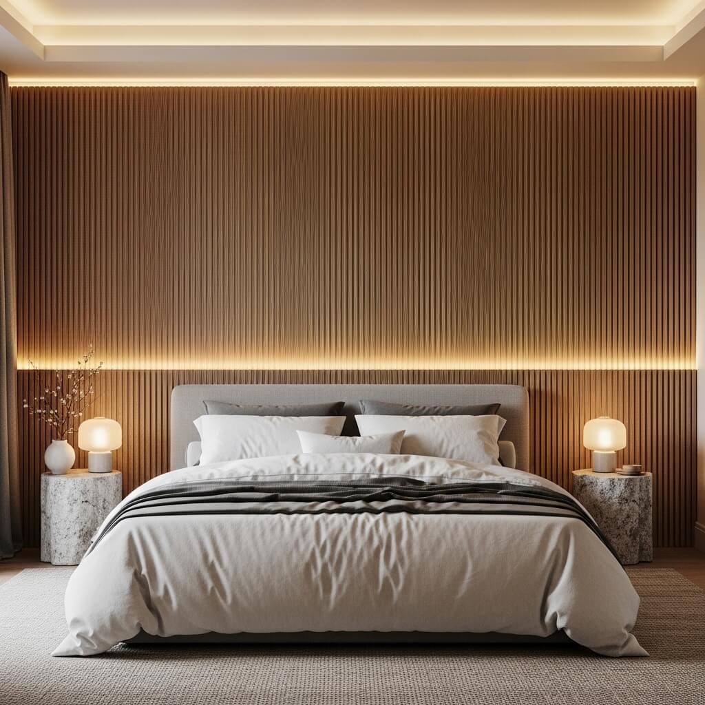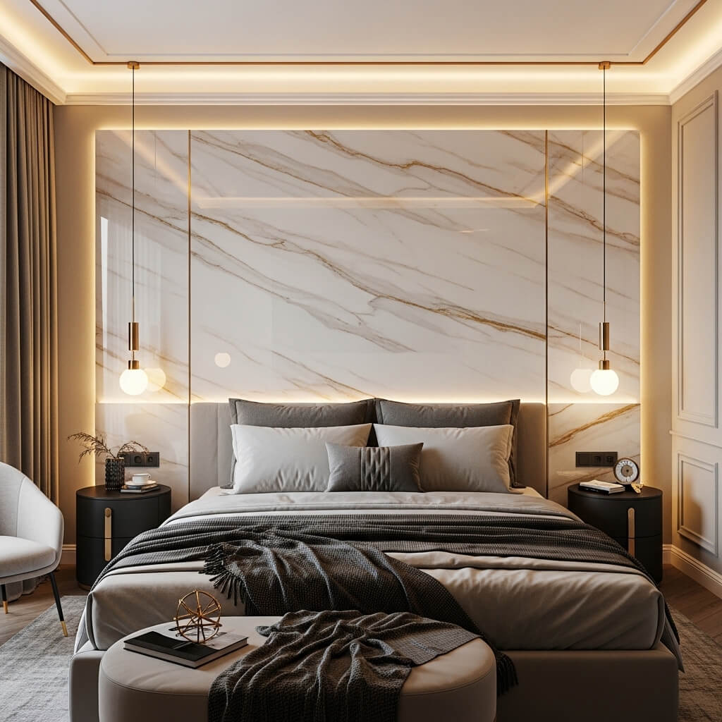 One of my favorite tricks? Adding a minimal bedside sconce that washes light down the surface of the marble panels. The way the light plays across the veining patterns creates this incredible movement and depth that’s absolutely mesmerizing.