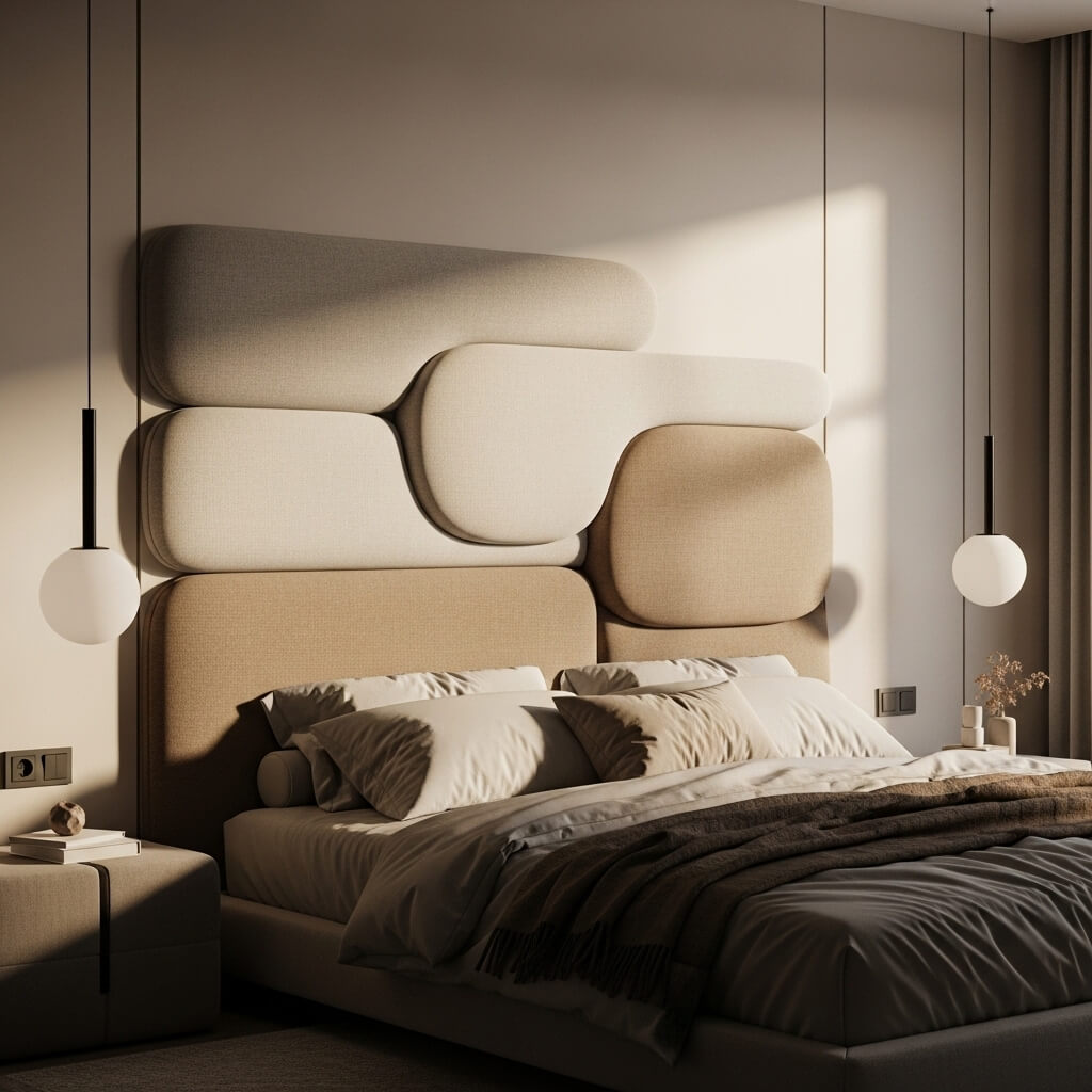 What makes this concept so special is the dimensionality. Instead of a flat surface, these headboards feature overlapping panels of fabric in varying shapes, creating subtle shadows and visual interest through texture rather than pattern or color.